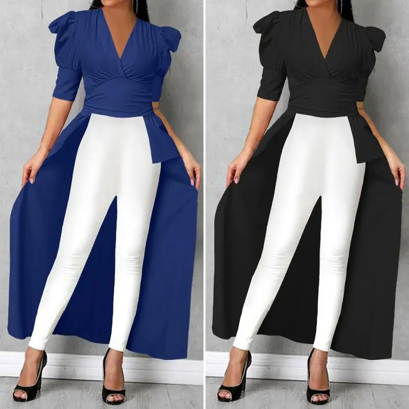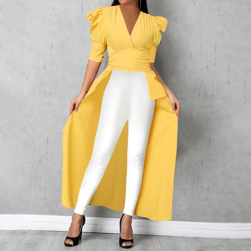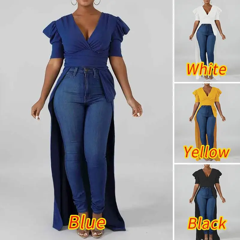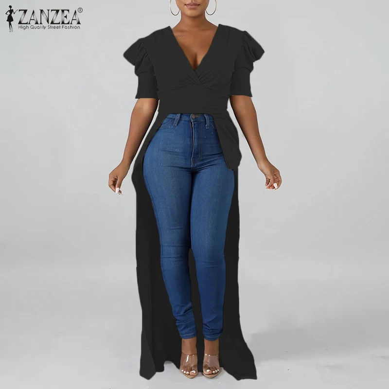 Модная блузка с пышными рукавами, асимметричная, ZANZEA, летняя, женская, с v-образным вырезом, повседневная, сексуальная, однотонная, длинная рубашка, женская уличная блуза, топы