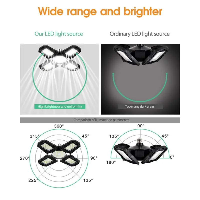 -Деформируемый потолочный светильник: светодиодное освещение гаража светильник с уникальной регулируемой широкоугольной конструкцией, Каждое крыло регулируется на 90 градусов, что может иметь идеальную кривую распределения гарасветильник в соответствии с вашим приложением, благодаря этому световое покрытие займет 360 °. Идеально подходит для гаража, мастерской, склада, подвала, автомагазинов, автопортов, почтовых отправлений, мастерской, где угодно нужен яркий светильник.
