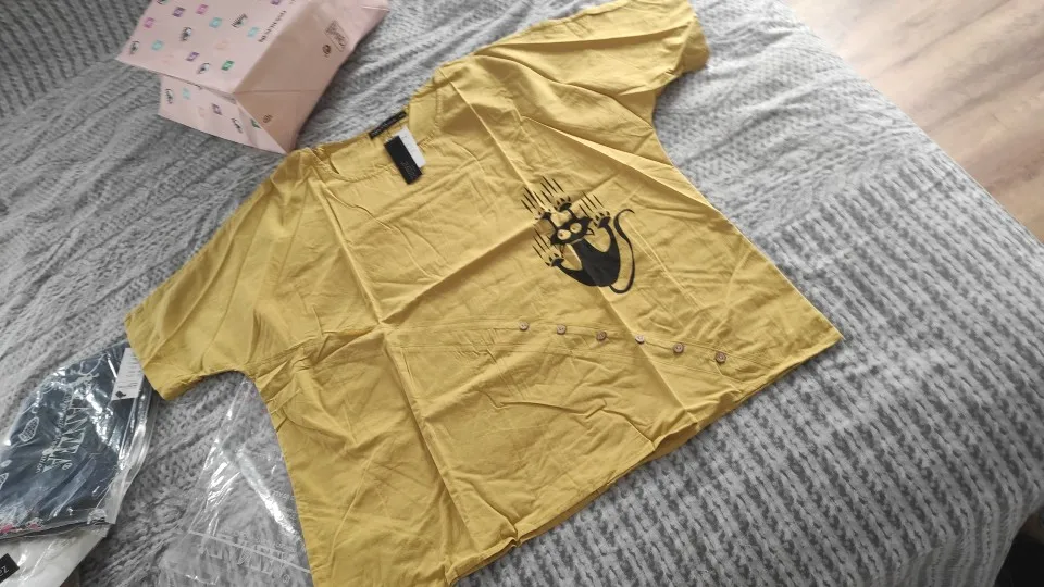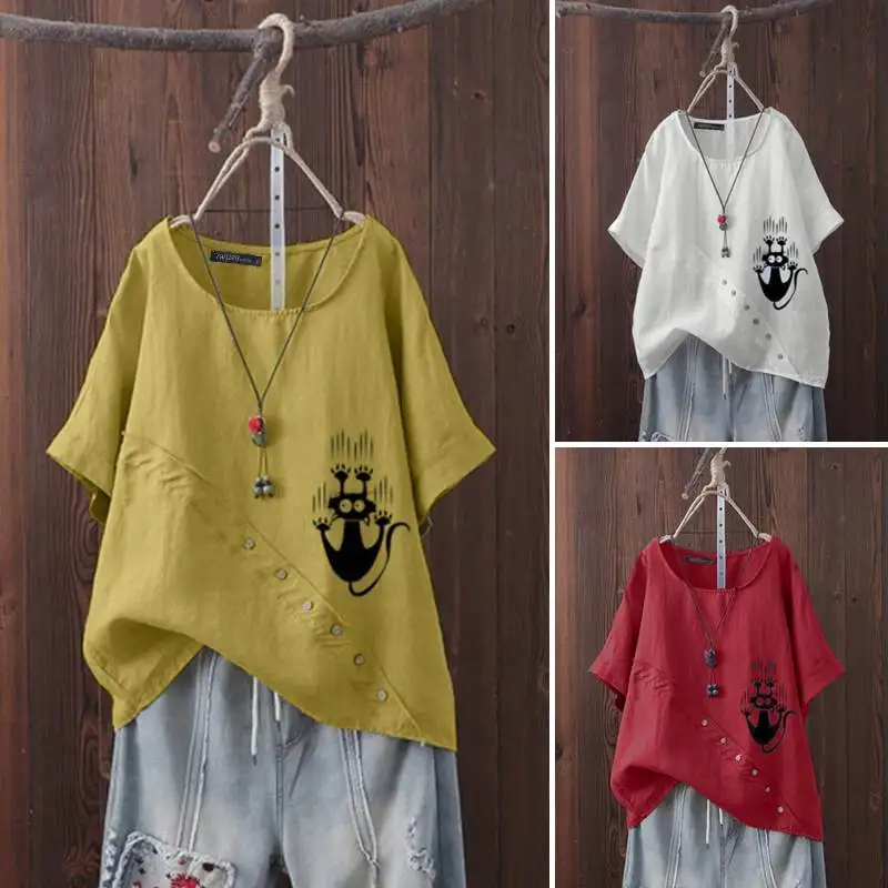 Блузка ZANZEA женская повседневная с принтом кота, винтажная туника с коротким рукавом, свободный хлопковый топ, Однотонная рубашка, на лето