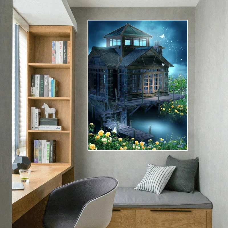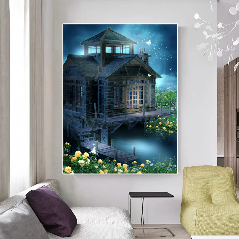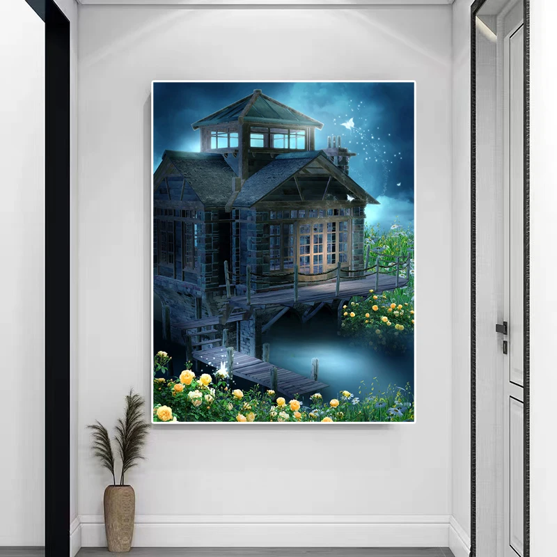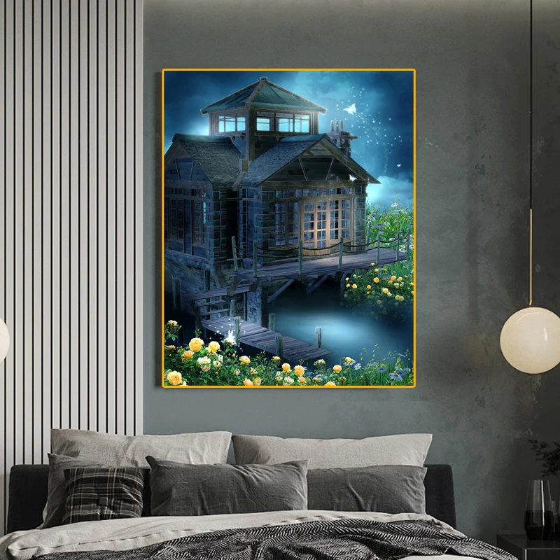 Картина на холсте с изображением деревянного дома, пейзаж Фэнтези, плакаты и принты, настенные картины, картина для украшения дома в скандинавском стиле, гостиной