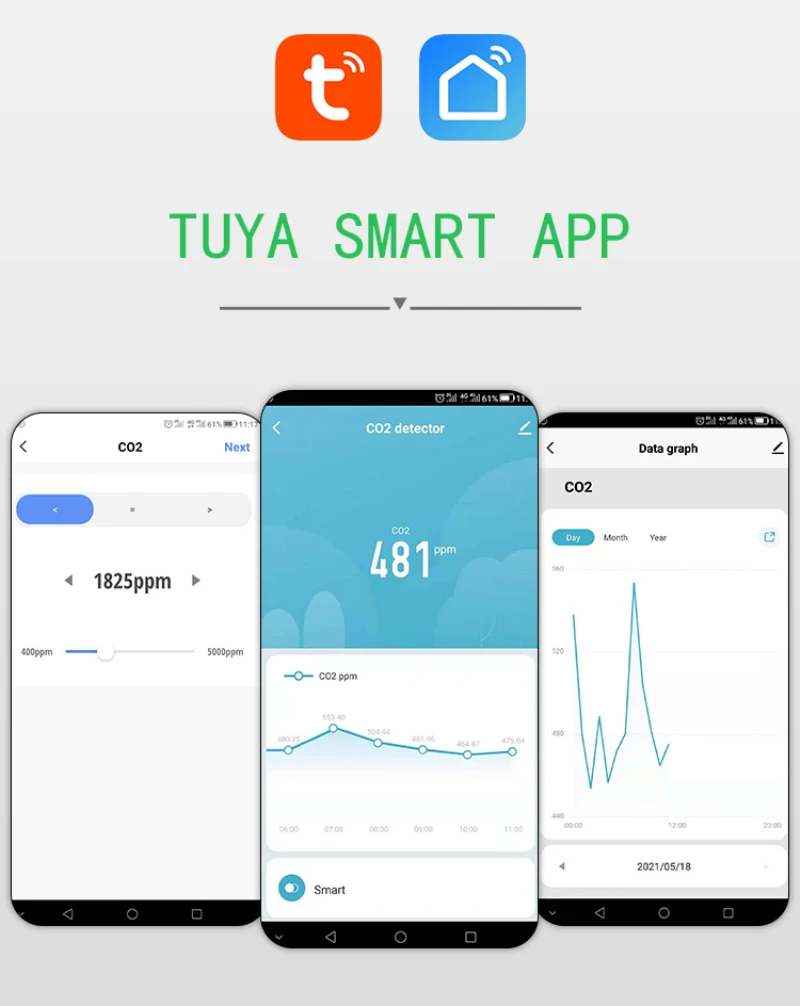 Домашняя среда находится под контролем в режиме реального времени просмотр домашней концентрации C02 через умное приложение Tuya