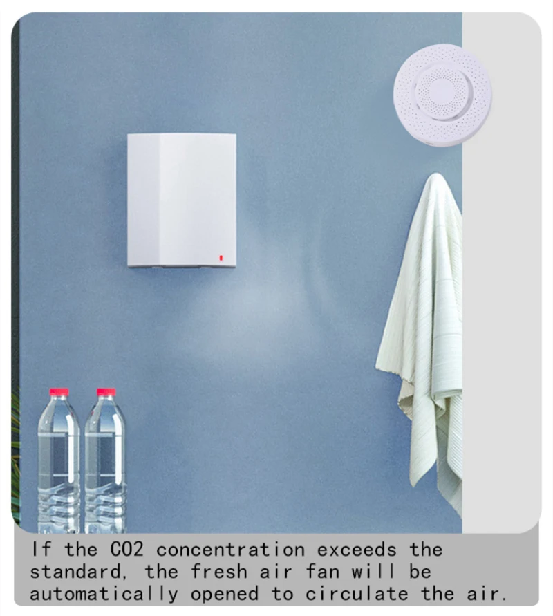 CO2 box-это интеллектуальное устройство для удаленного мониторинга концентрации CO2 в воздухе в режиме реального времени. Он может быть установлен заранее и автоматически контролировать граффити дома, когда экологические параметры превышают стандарт. Интеллектуальный Кондиционер, вентилятор свежего воздуха, увлажнитель воздуха и очиститель воздуха могут оптимизировать окружающую среду.
