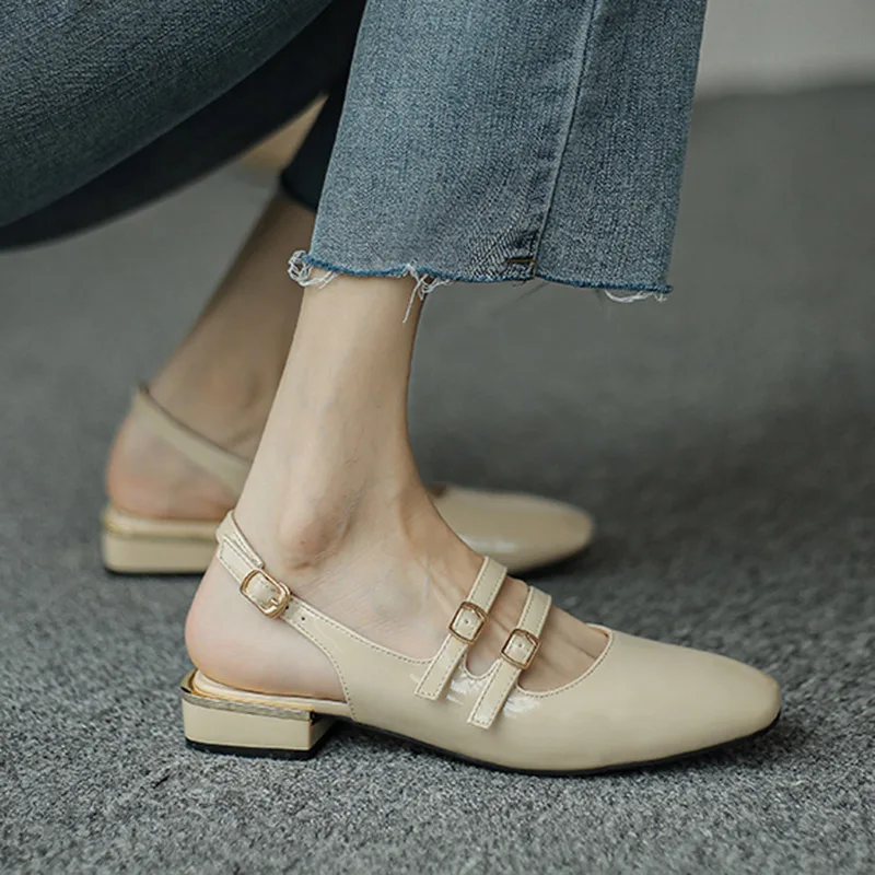 Босоножки женские из лакированной кожи, Классическая обувь на плоской подошве, с двойной пряжкой, с ремешком сзади, 9278N, лето