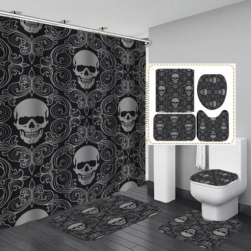 Занавеска для душа из полиэстера, нескользящий коврик для ванной, крышка унитаза, домашний декоративный набор для ванной комнаты, серый, черный, с черепом
