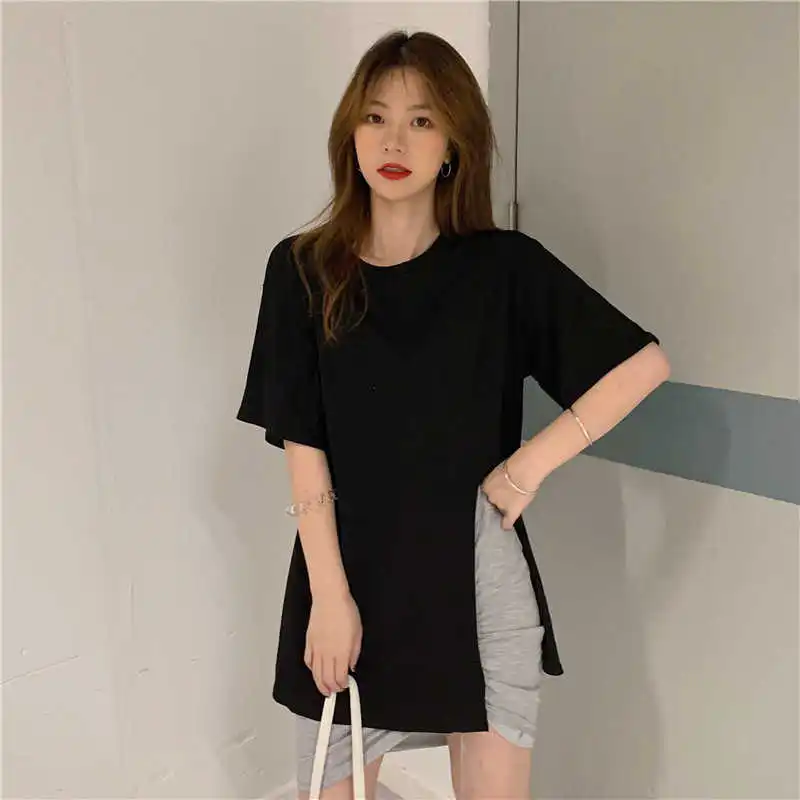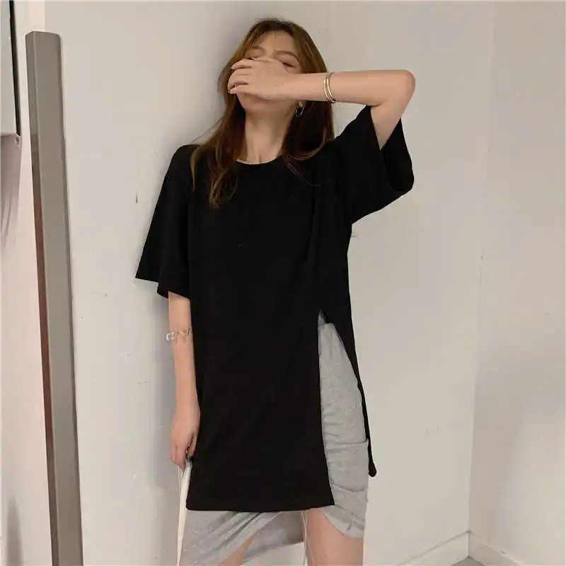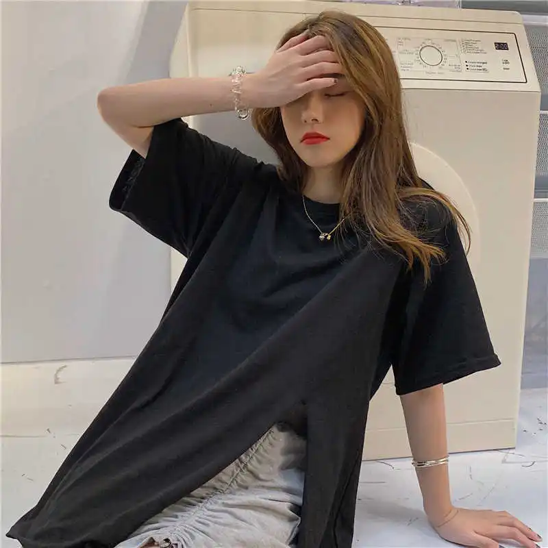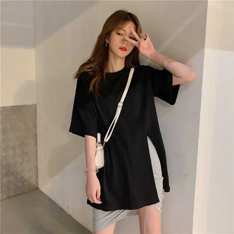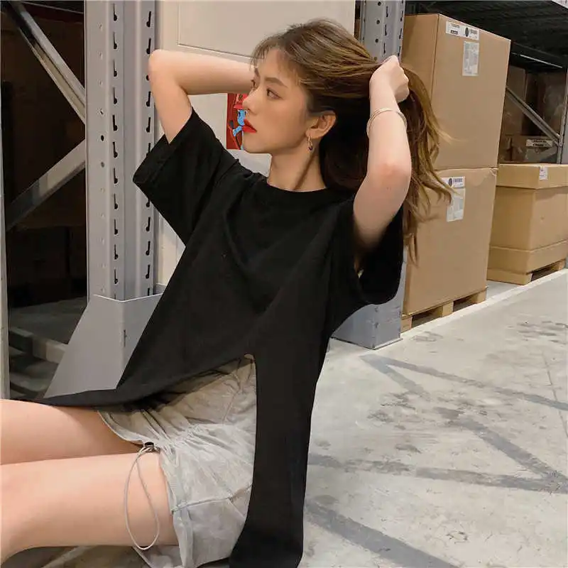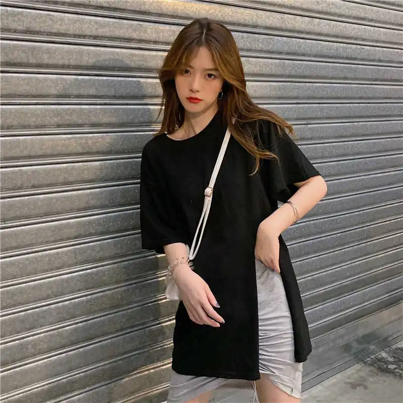 Женская длинная футболка в Корейском стиле, свободная черная футбол...