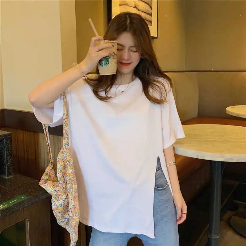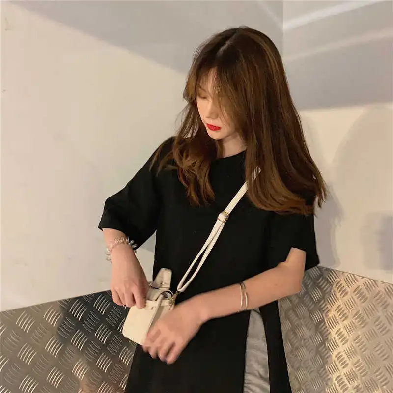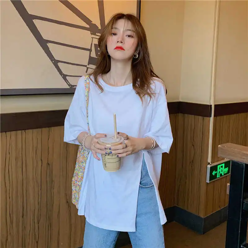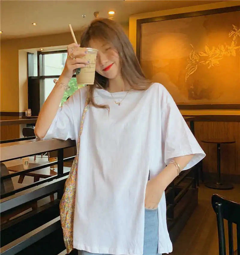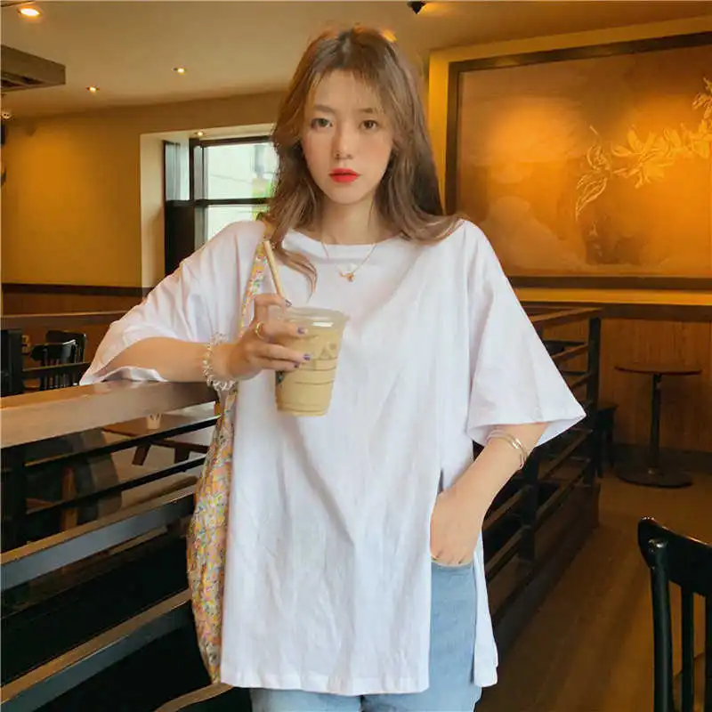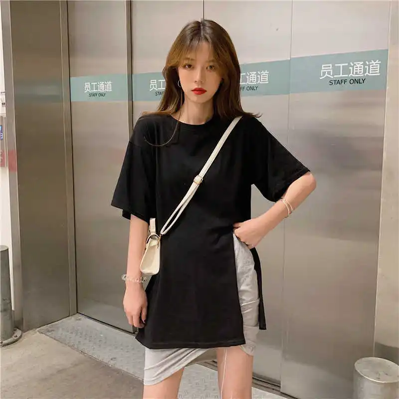 Женская длинная футболка в Корейском стиле, свободная черная футбол...