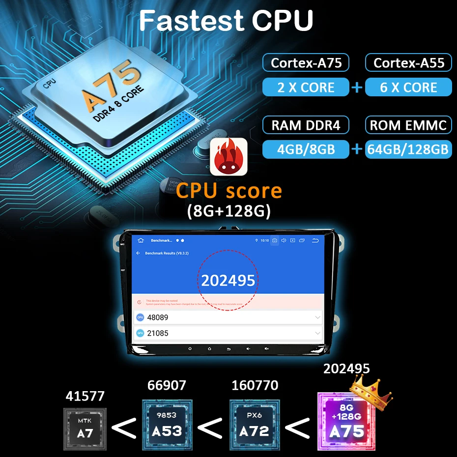 Самый быстрый процессорСамый быстрый процессор на современном рынке.Лучше, чем PX5 PX6 7862 9853 или другие ЦПAntutu Score- 202495, это самый высокий балл во всех ЦП в настоящее время