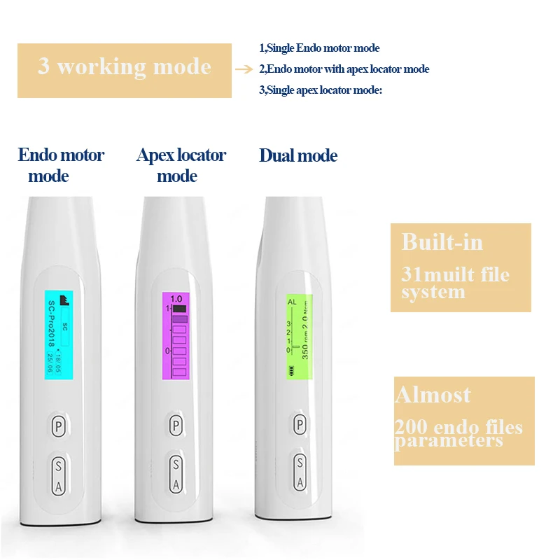 * Когда провод не подключен и машина включена, это режим двигателя endo, экран светло-голубой, и дисплей будет цикл между именем системы и параметрами. * Двигатель автоматически изменяется, когда файл получает крутящий момент превысит крутящий момент, который вы установите, звуковой сигнал будет кольцо, экран изменится на красный. Эта функция может защитить файл, избегая поломки внутри корневого канала. * Машина имеет встроенные параметры системы корневых каналов, которые можно легко назвать пользователем или установить самостоятельно. Возвратно-поступательное движение можно установить на различные возвратно-поступательные углы и скорости для удовлетворения всех текущих требований к возвратно-поступательному движению