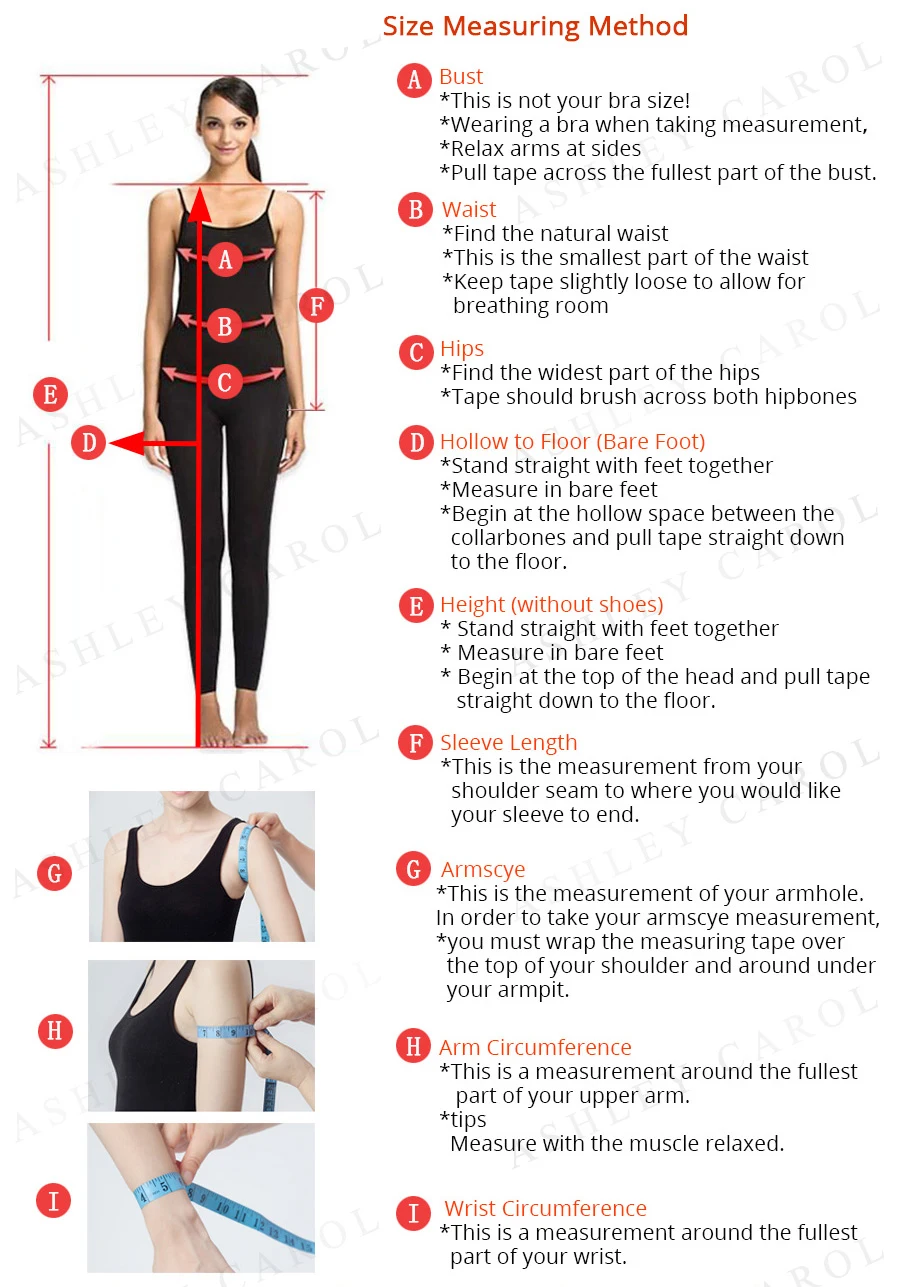 А. Грудь _ см/дюймыB. Талия _ см/дюймыC. Бедра _ см/дюймыD. Полый в пол (без обуви) _ см/дюймыЕ. Высота (от верха до пола, без обуви) _ см/дюймF. Длина рукава _ см/дюймыG. Рука глаз _ см/дюймыH. Окружность руки _ см/дюймыI. Окружность запястья _ см/дюймыJ. Высота каблука (обувь, которую нужно носить в день ношения этого платья) _ см/дюймыК. День вашей свадьбы