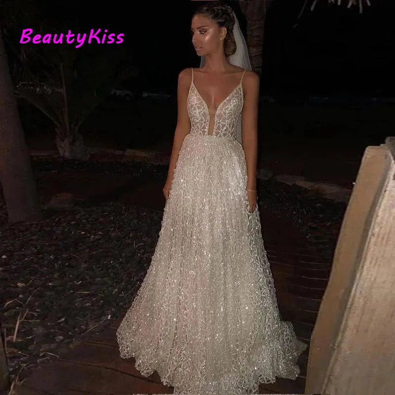 ТРАПЕЦИЕВИДНОЕ свадебное платье принцессы, сексуальные фатиновые Свадебные платья на бретелях-спагетти с блестками, индивидуальный пошив