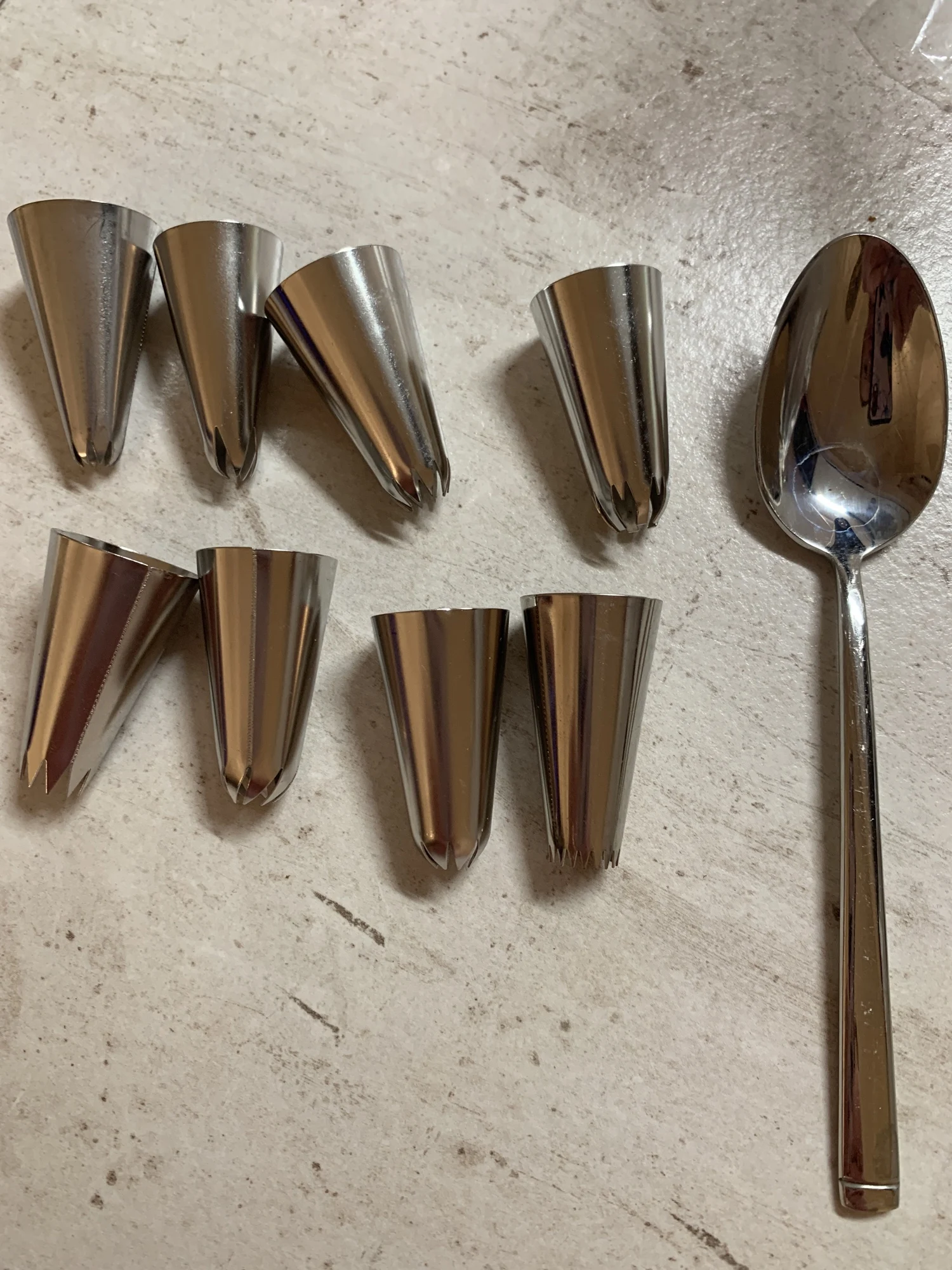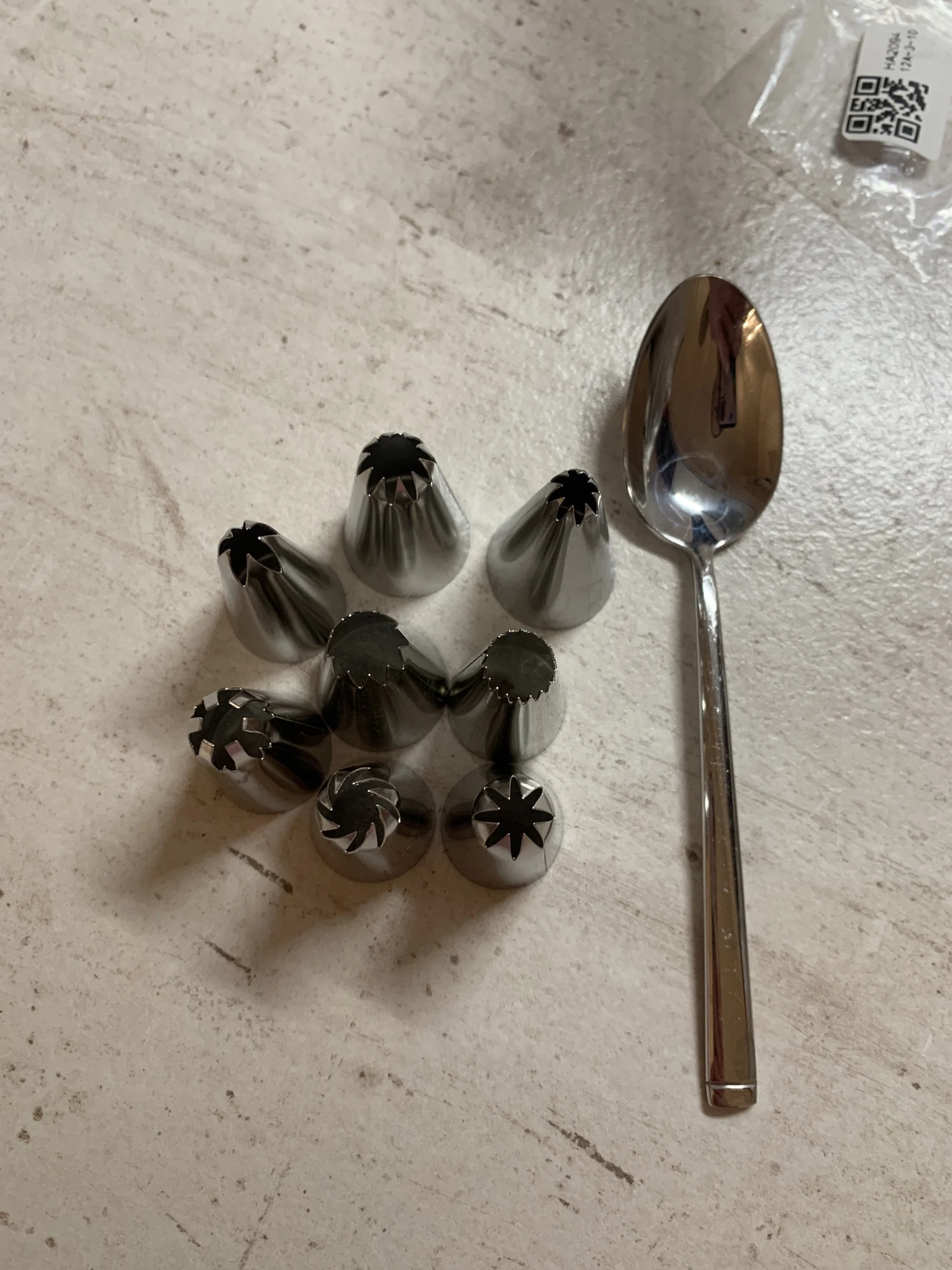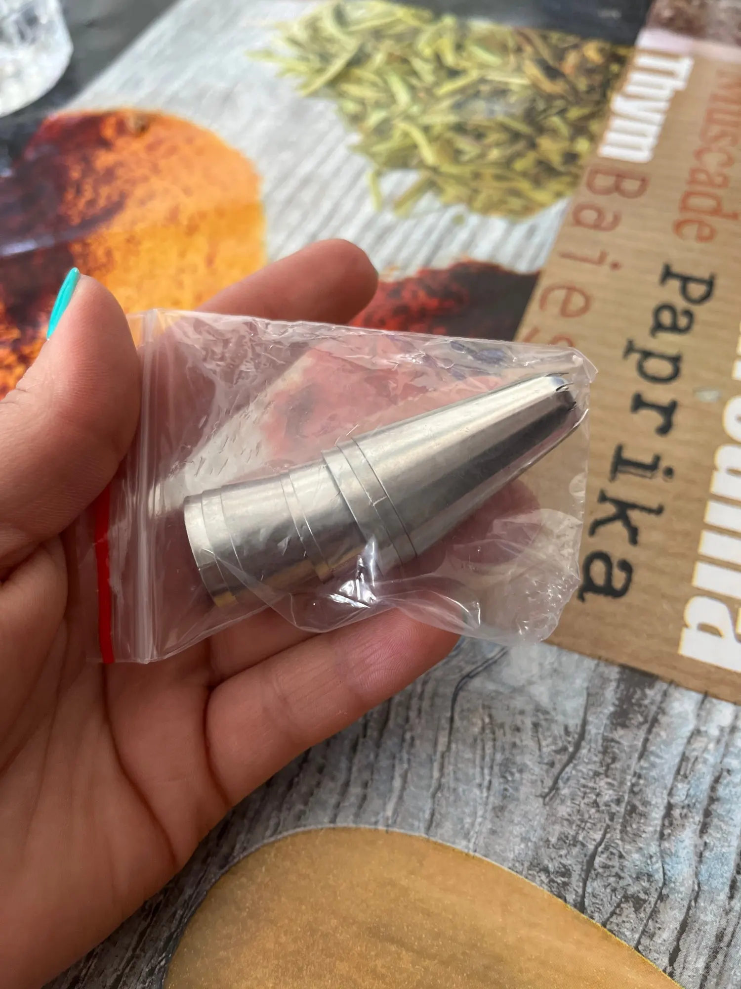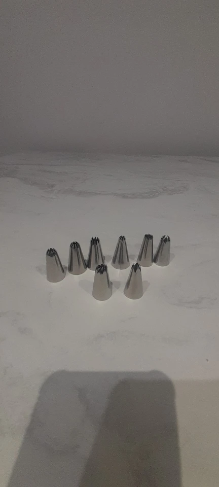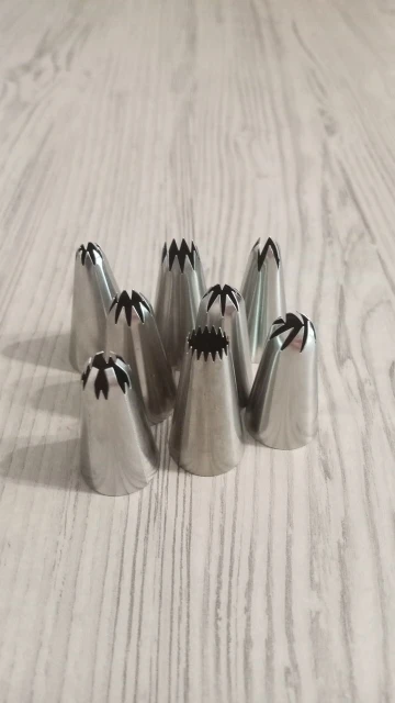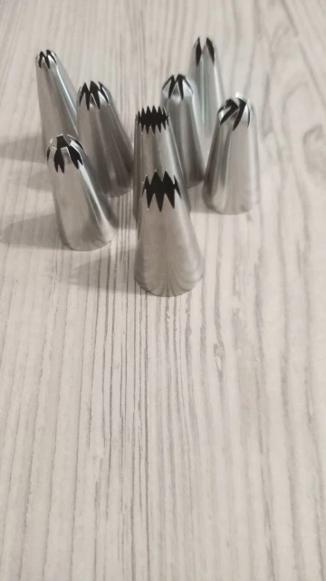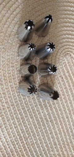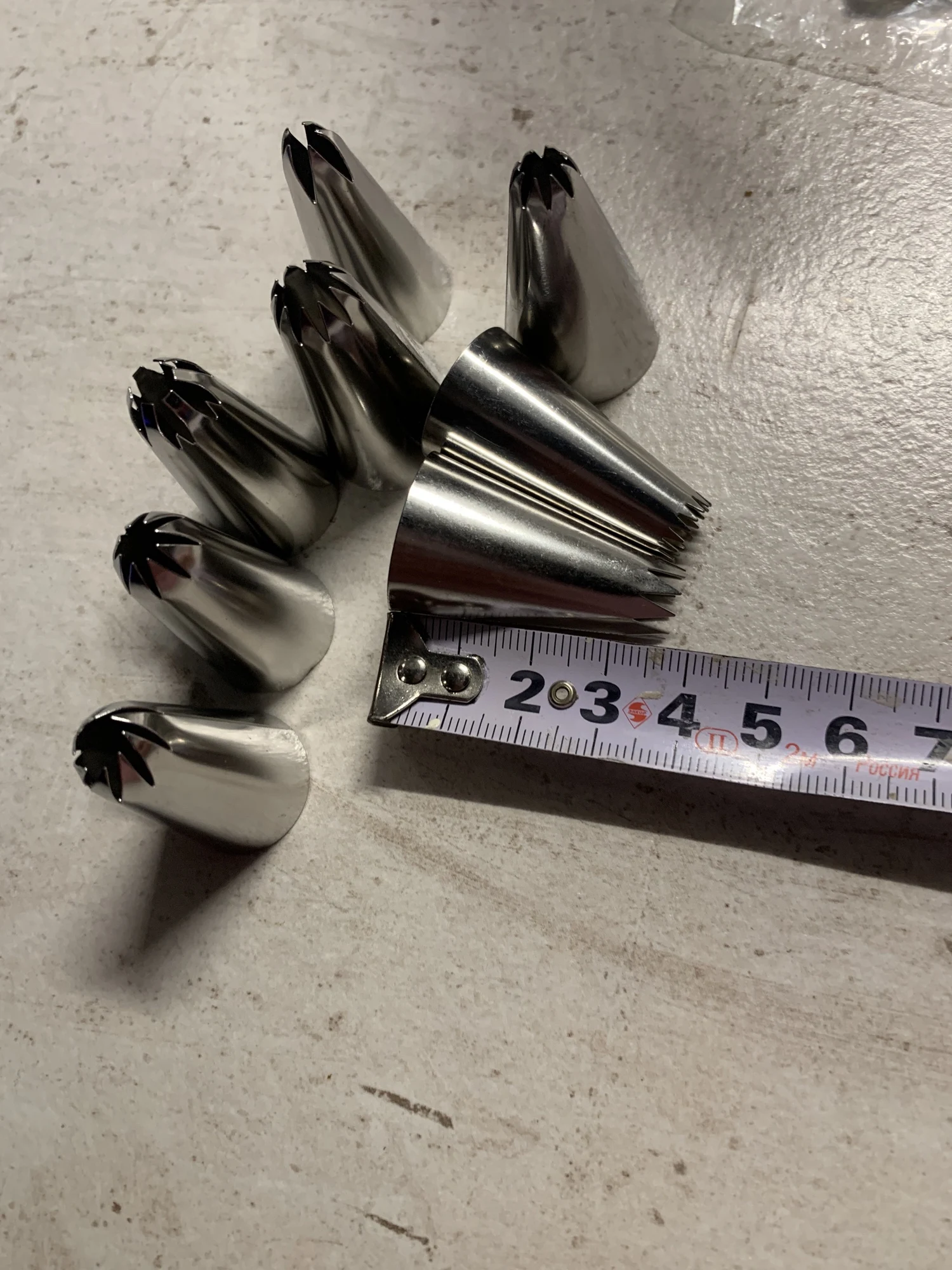 Доставка в Хорватию за 9 дней. Товар соответствует описанию, имеется 8 насадок. Высота немного меньше 4 см, диаметр входа 2 см, диаметр выхода от 0,5 до 1 см. Не большой, средний размер-подходит для украшения тортов, но не для зефира или заварных тортов.