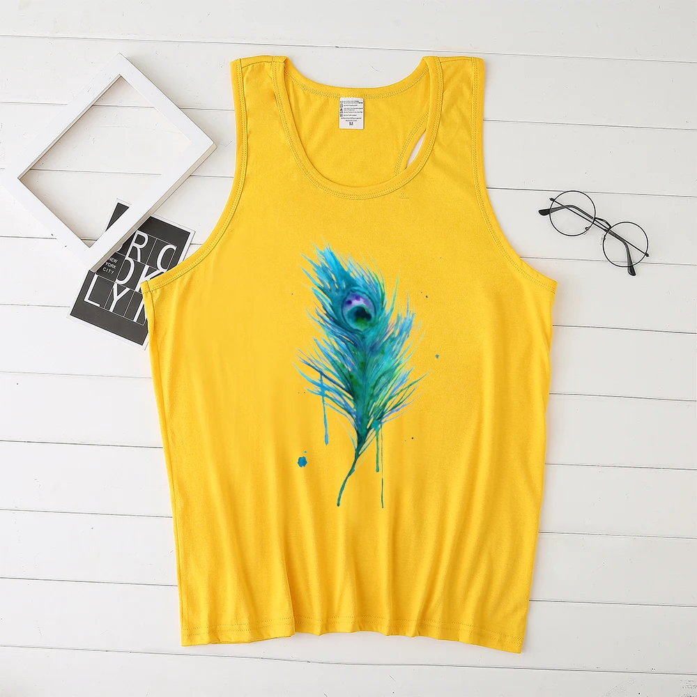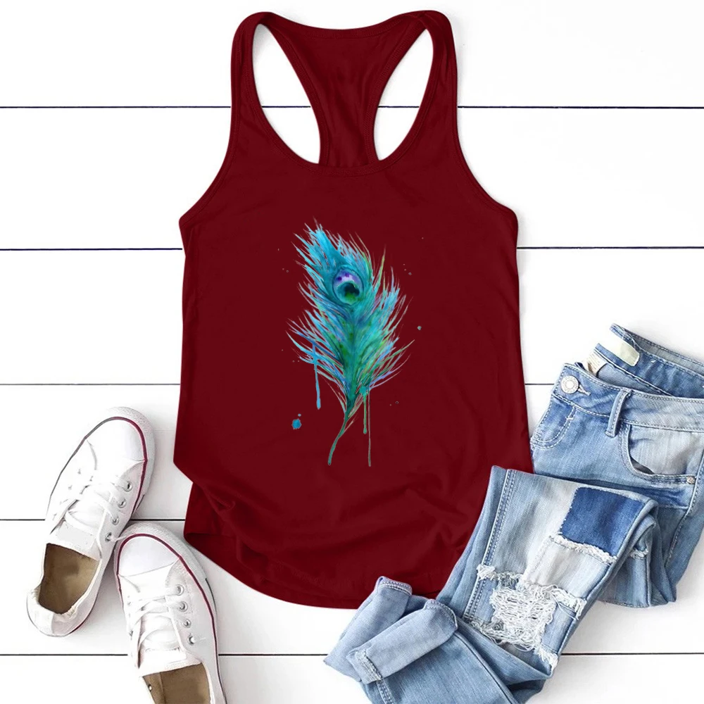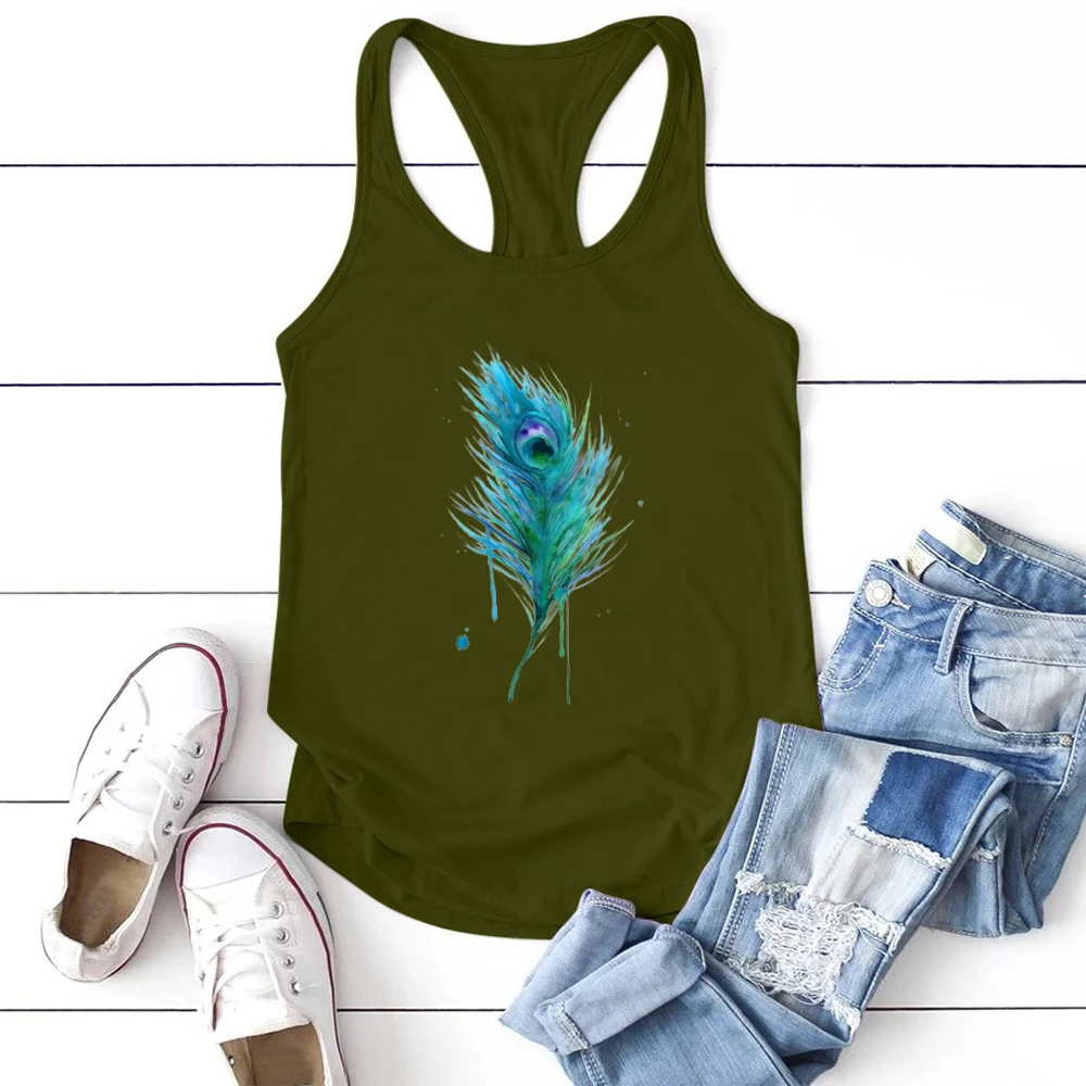 Женская Винтажная Майка с принтом в виде зеленых перьев, свободная майка без рукавов, одежда для женщин, Повседневная футболка, лето размера плюс