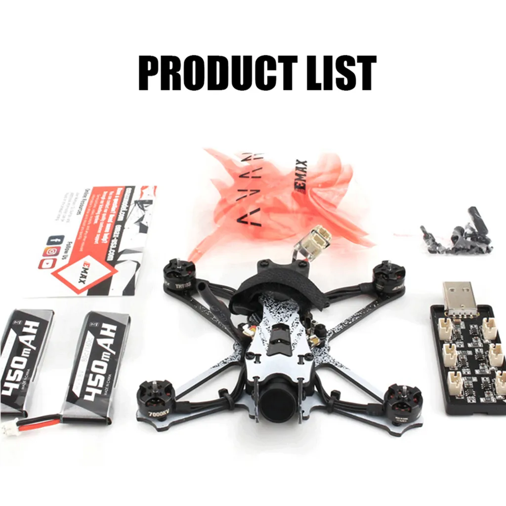 1 x Tinyhawk II Фристайл 2,5 дюймов небольшой гоночный Дрон с видом от первого лица 2 x Аккумулятор Emax 1s HV 450 mAh 1 x Зарядное устройство 1 x Набор пропеллеров (4x CW, 4x CCW) 1 x Винтовая упаковка 1 x Руководство пользователя