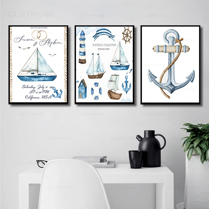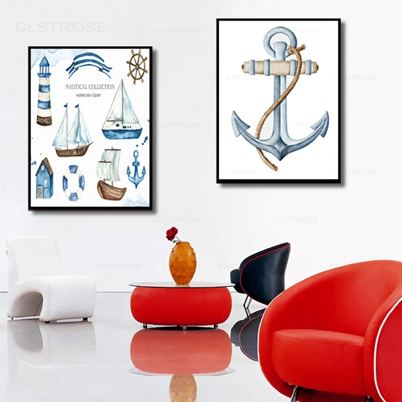 Постер для детской комнаты, акварельный корабль, якорь, маяк