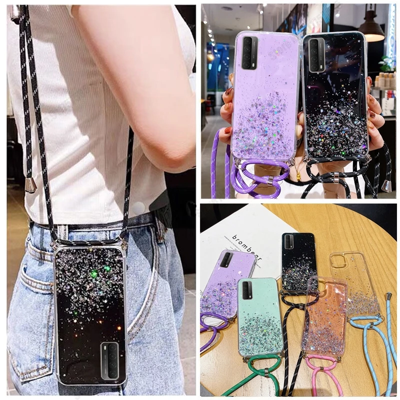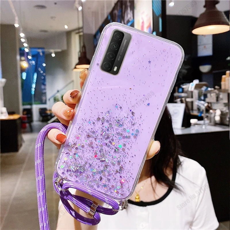 Чехол для Huawei Y7A Y8S, блестящий силиконовый чехол для Huawei P Smart 2021 Y6 Prime Y9 2018, чехол с ремешком и шнурком и цепочкой