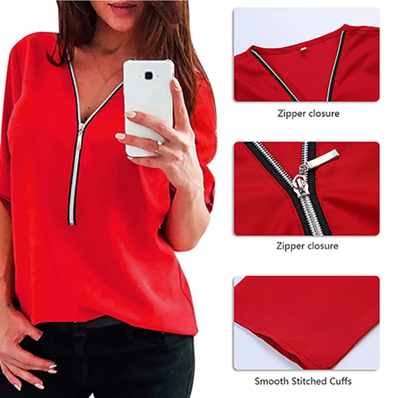 2021 Европейская Новая мода женская блуза с коротким рукавом на молнии с пуговицами Топы женские с v-образным вырезом Повседневная Свободная шифоновая рубашка Vestidos Mujer