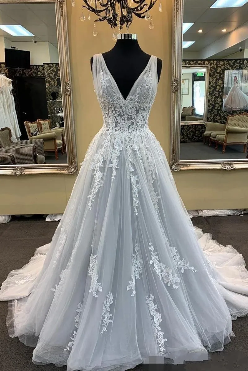Свадебное платье ANGELSBRIDEP, с V-образным вырезом, серебристо-серого цвета, с аппликацией, со шлейфом