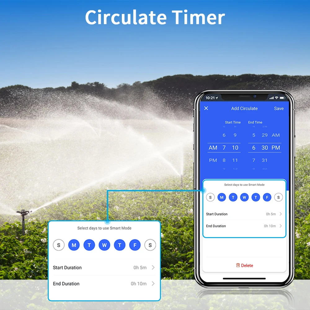 Вы можете установить продолжительность включения и выключения в течение определенного периода. Очень удобно для орошения сада.