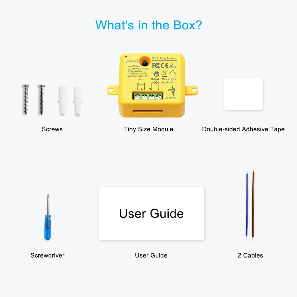 1 Умный модуль (желтый) 1 * набор винтов 1 * Двусторонняя лента 1 отвертка 2 * кабели для проводки 1 * Руководство пользователя
