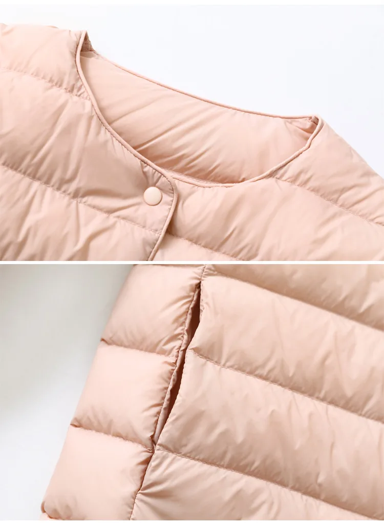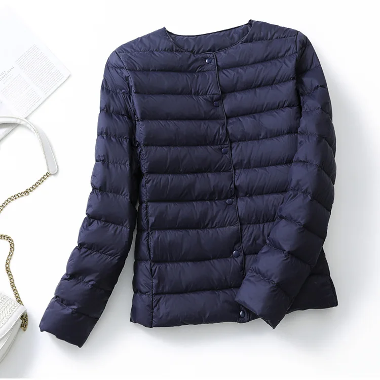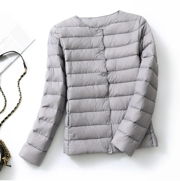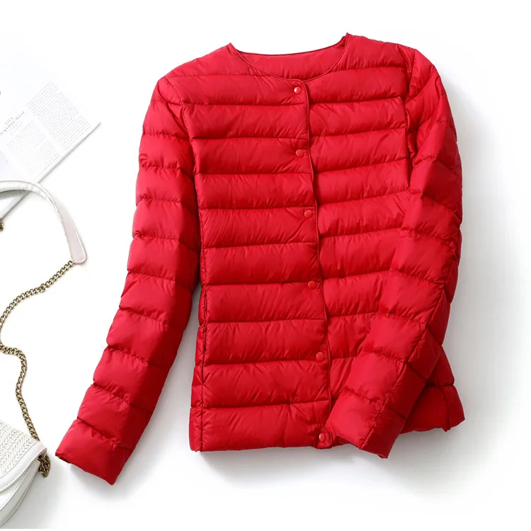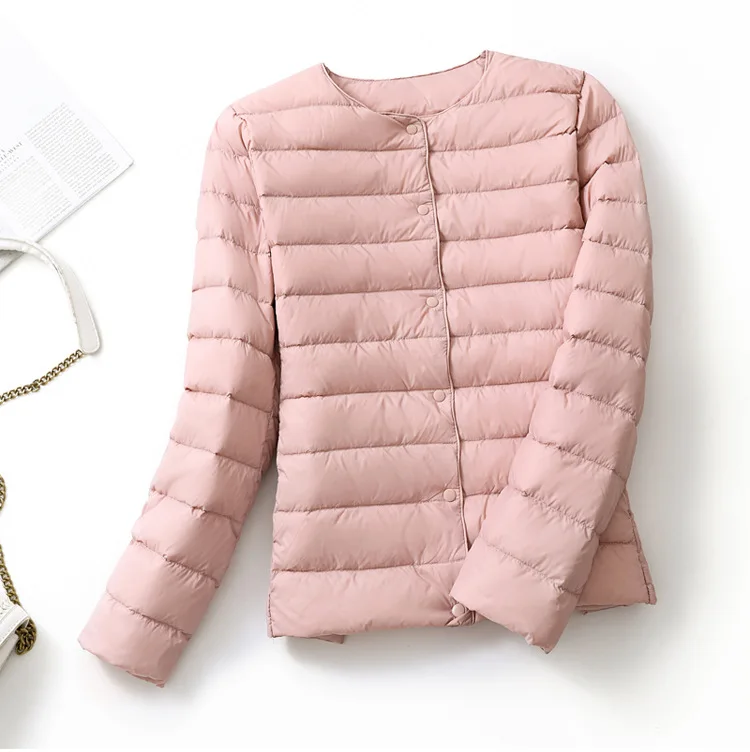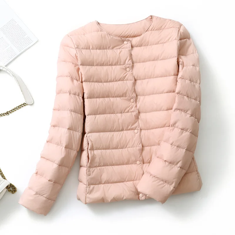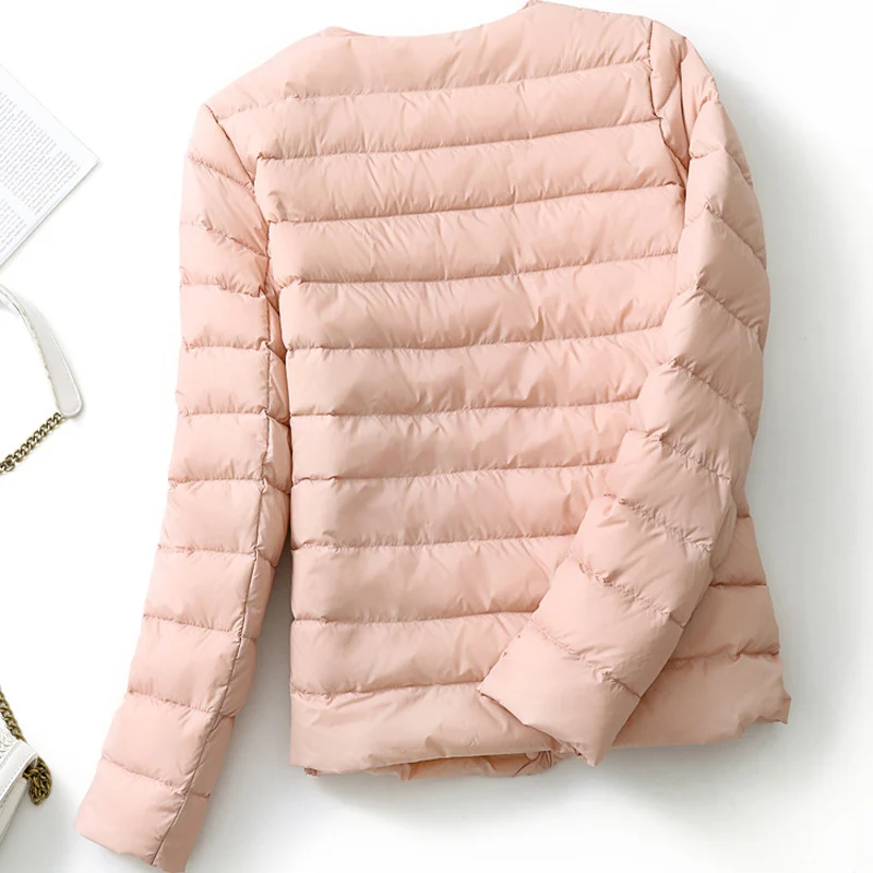 Женские Сверхлегкий дутые зимние куртки 2021 новые конфеты Цвет без воротника пальто на утином пуху женский Портативный ветронепроницаемая парка для размера плюс