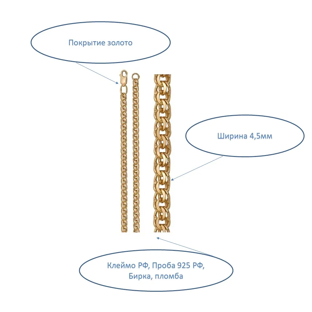 Цепь тренд 2021 NOVOZOLOTO серебро подлинное 925 пробы, плетение бисмарк, покрытие золото, производство Россия, бирка завода РФ