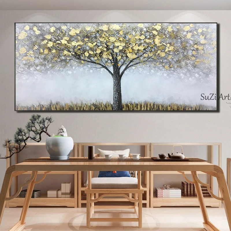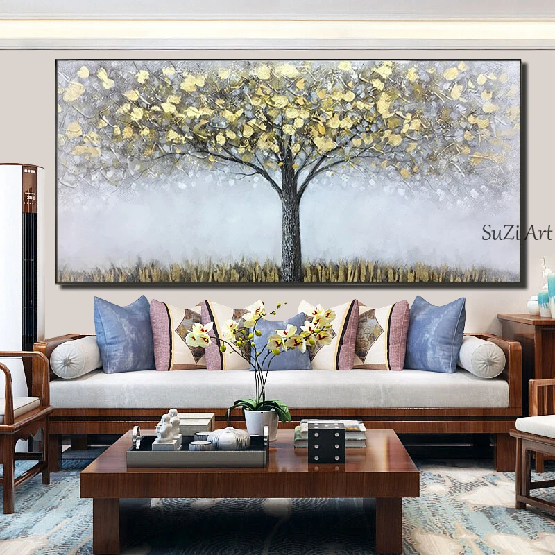 Новая богатая Золотая ручная роспись с деревом для ресторана Большая Золотая абстрактная живопись 1 шт. художественные картины Домашний Декор без рамки