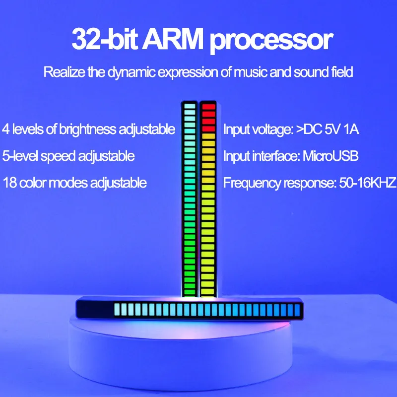 1. 【Визуализация вашей любимой музыки】с 32 цветными светодиодными лампами, высокочувствительным микрофоном и функцией шумоподавления, индикатор аудиоспектра RBG обеспечивает 8 режимов отображения, 4 уровня яркости и 5 уровней скорости. Вы можете просто настроить его так, чтобы достичь желаемого динамического выражения для выбранной Вами музыки.