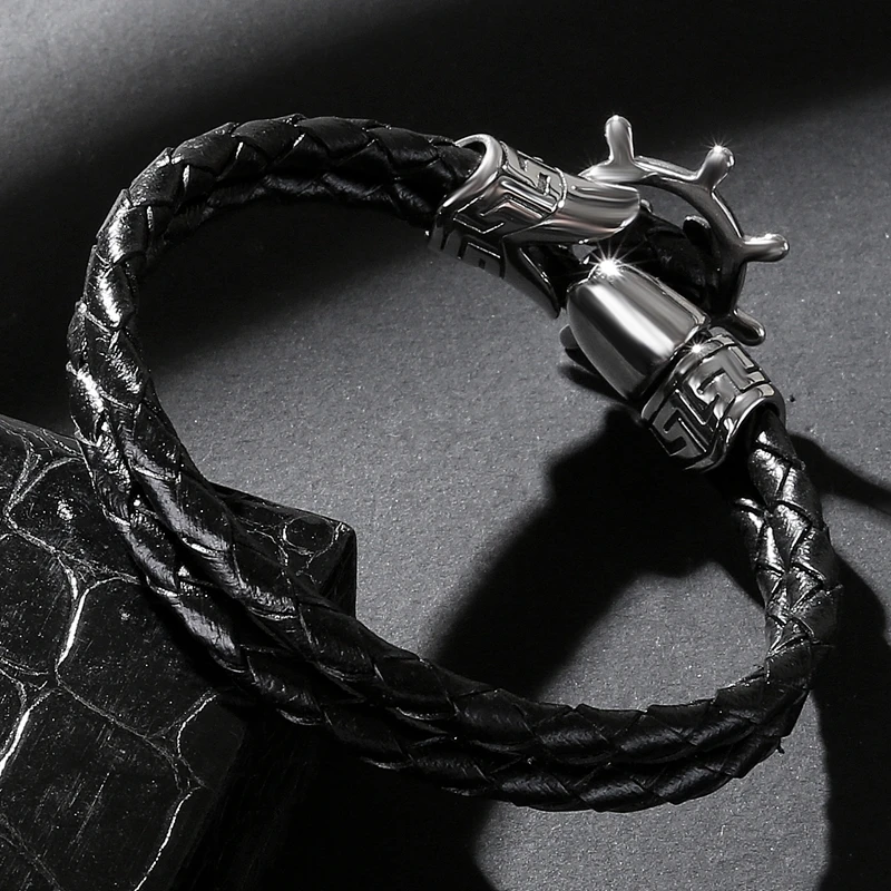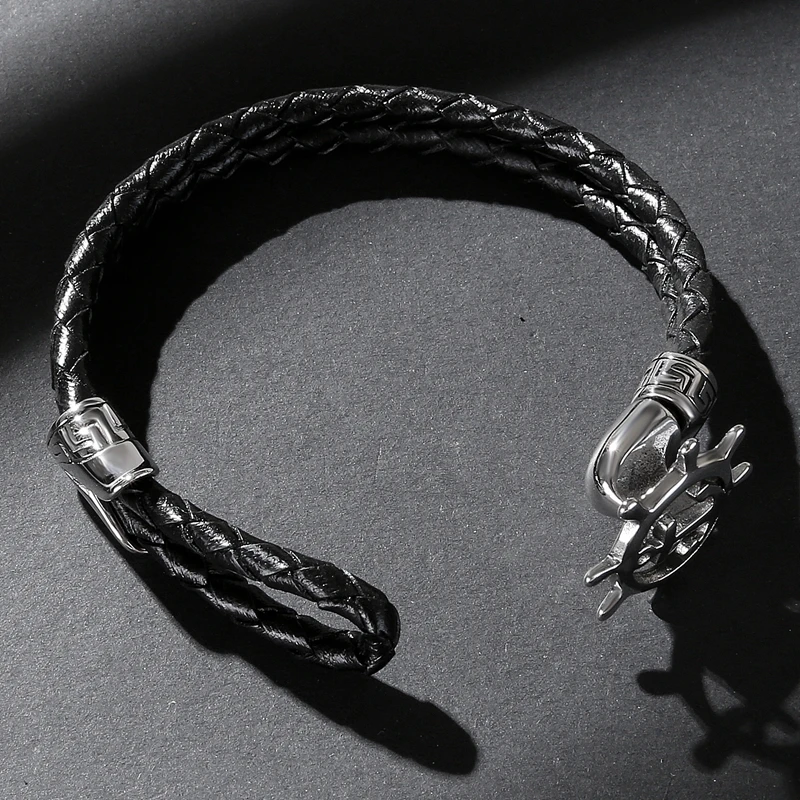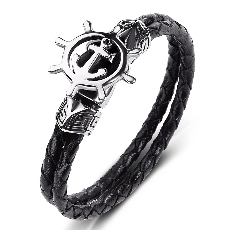 Браслет из натуральной кожи, мужской, в стиле панк, из нержавеющей стали, с якорем, штурвалом, плетеный кожаный браслет, подарок, P540