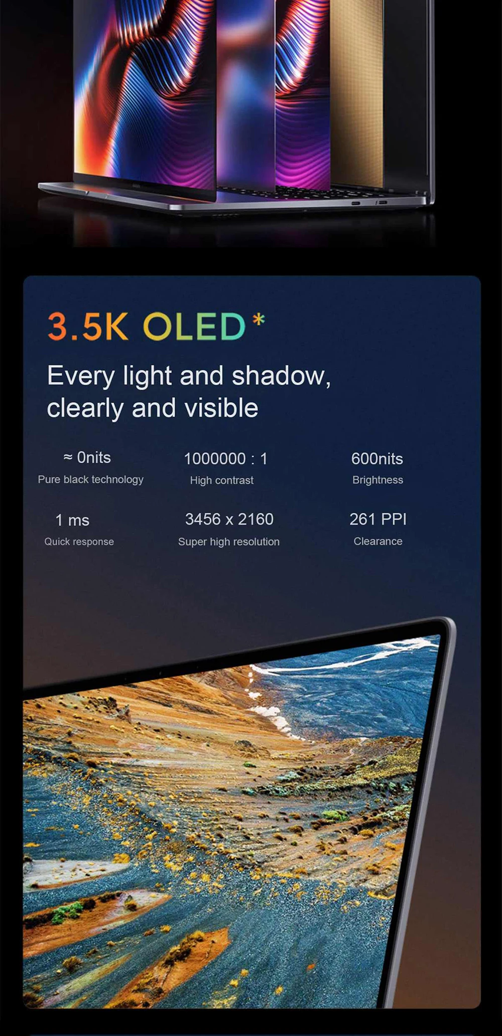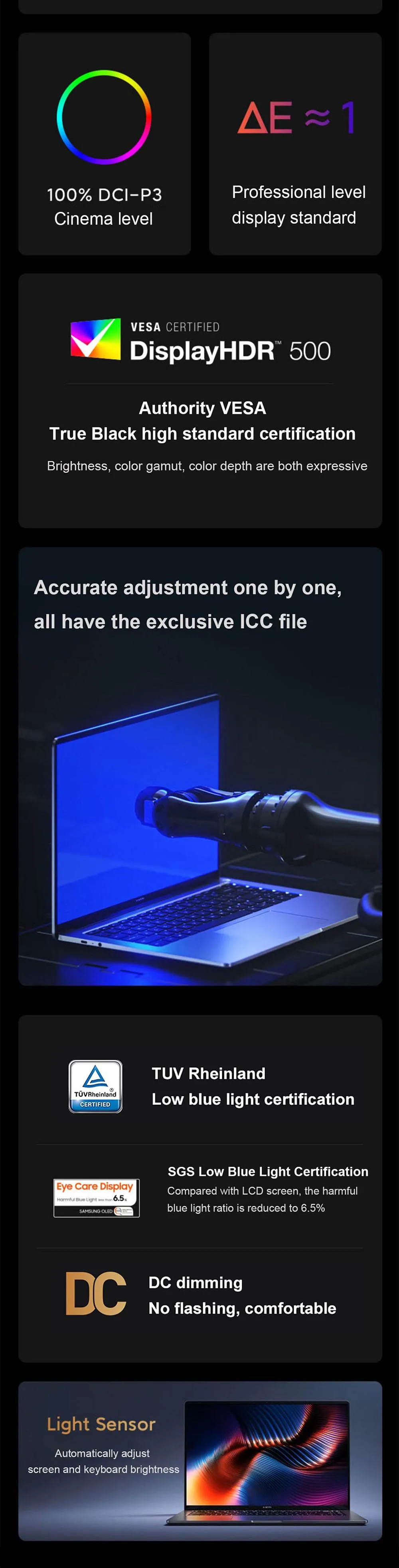 15,6 "OLED супер Retina ЭкранРазрешение 3456x21603,6 мм узкой рамкой * 93% соотношение экрана к корпусу *, Delta E ≈ 1 (типичное значение)16:10 соотношение дисплея, защитное стекло Corning, угол обзора 170 °, 261PPI600 нит пиковая яркость, 1000000:1 Коэффициент контрастности *,100% sRGB цветовая гамма/100% DCI-P3 цветовая гамма на уровне кинотеатра, поддержка диммирования постоянного тока *, частота обновления 60 ГцПрошел TüV Rheinland Уровень оборудования низкий синий светильник сертификацииSGS низкий синий светильник Сертификация