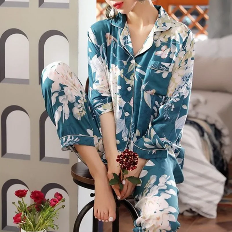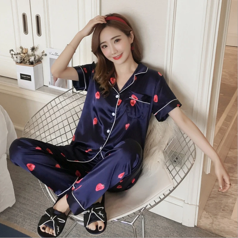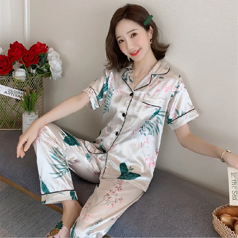 Новинка лета 2022, Женский пижамный комплект, сексуальная шелковая атласная ночная рубашка с отложным воротником, одежда для сна, длинные брюки с коротким рукавом, женская одежда