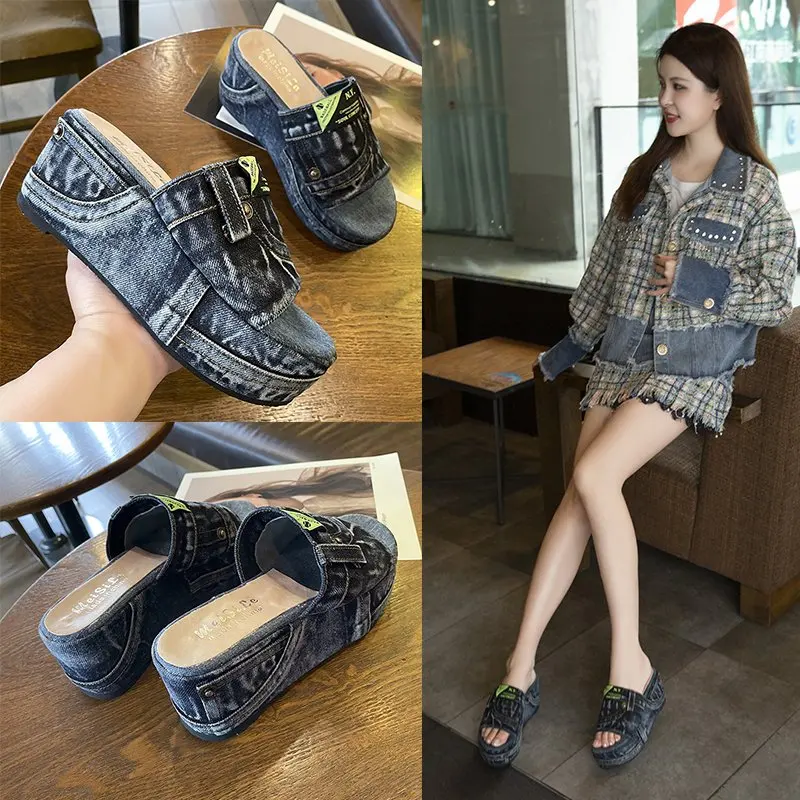 Сандалии женские из денима на танкетке, пляжные шлепанцы на толстой подошве, сланцы, пикантная повседневная обувь с открытым носком, для улицы, 021