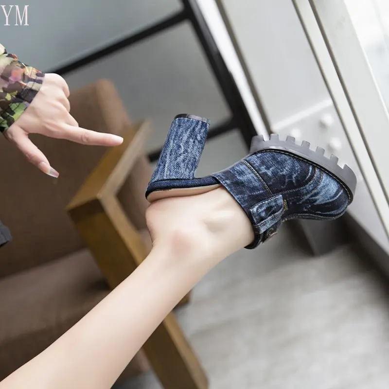 Сандалии женские из денима на танкетке, пляжные шлепанцы на толстой...