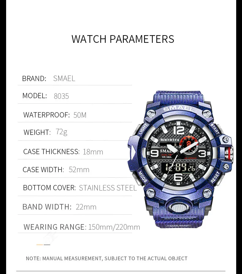 SMAEL мужские спортивные часы с двойным временем цифровые часы кварцевые 50 м водонепроницаемые часы светодиодные военные часы спортивные 8035 мужские часы наручные часы