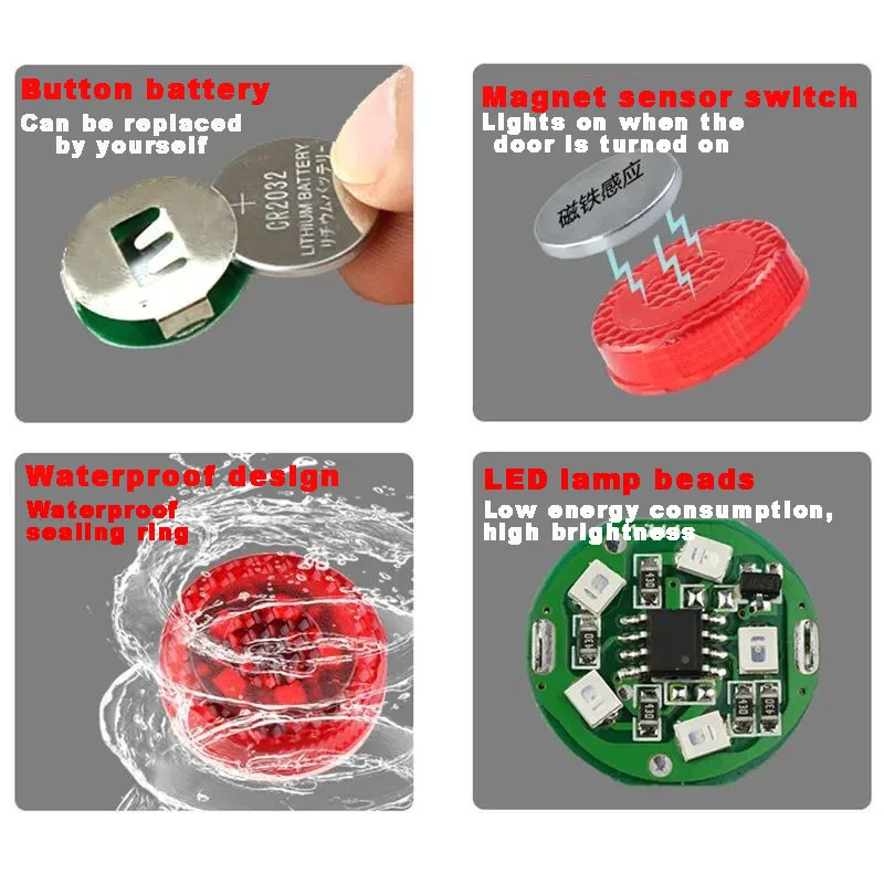 Название продукта: сигнальная лампа для автомобильной двериПитание: аккумулятор с кнопкой CR2032 3 В (не входит в комплект)Светильник источник света: светодиодныйСветодиодный Кол-во: 5 шт.Цвет излучения: красный, желтый, синий, rgbМатериал: АБС-пластик, магнитРазмер: около 28 мм * 8 мм (D * H)