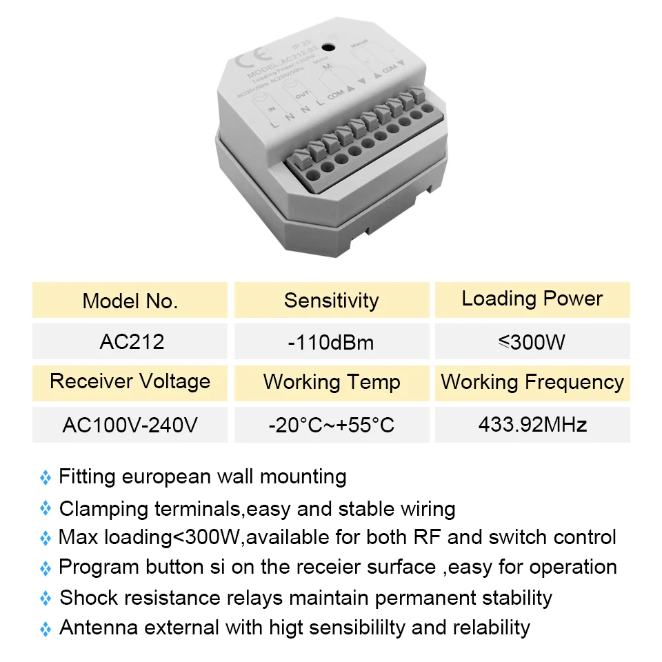 1. Маленький размер для скрытой установки2. Пробежка/Связывание для легкой резки, точный контроль положения электронных венецианских жалюзи3. Принятие анти-токовой схемы, подходит для двигателей, мощность которых ниже 300 Вт4. Стабильная производительность, сильная защита от помех5. Понижающее решение трансформатора, долговечная стабильность и надежность6. Передатчик (AC136 или AC123) имеет 6 каналов, и может быть подключен до 6 приемников.