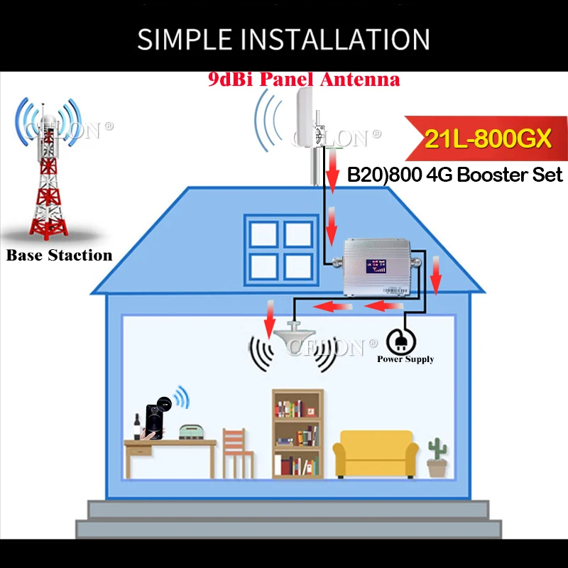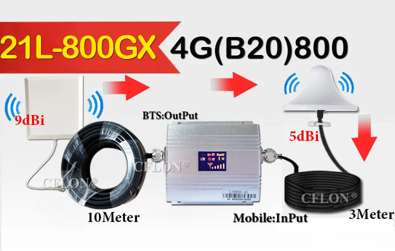 Что входит в комплект ----Только усилитель и штепсельная вилка ЕС = B20 LTE800Mhz 4G усилитель сигнала + источник питания ЕС;21L-800GX = B20 LTE800 + 9dBi Панель антенна + 5dBi потолочная всенаправленная антенна с 3 м кабель + Питание;