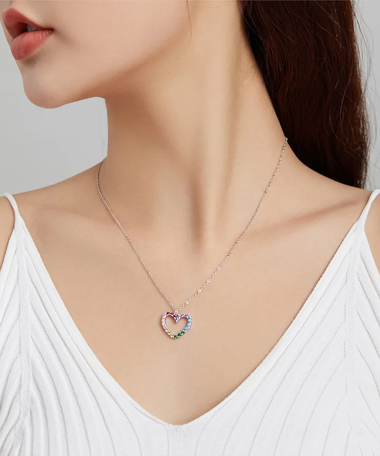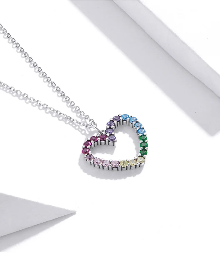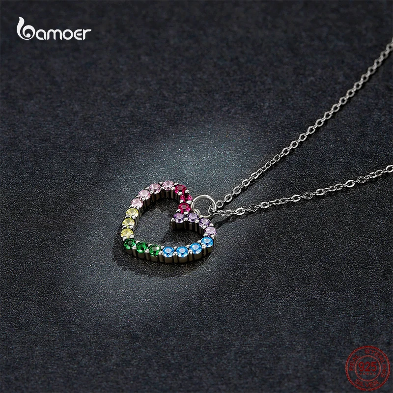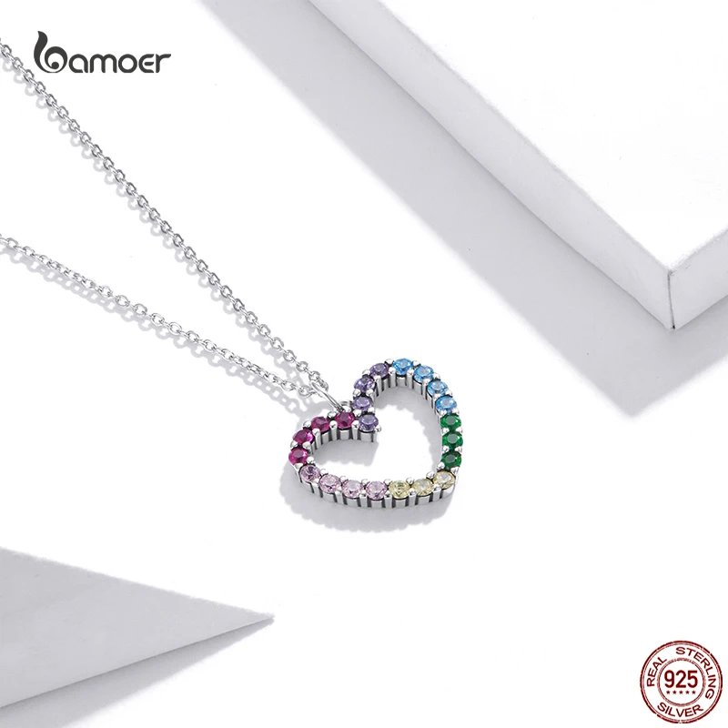 Женское Ожерелье с радужным сердечком Bamoer, ожерелье из стерлингового серебра 925 пробы с узором в виде сердечек, Ослепительная красочная цепочка из циркона, ювелирное изделие, подарок SCN449