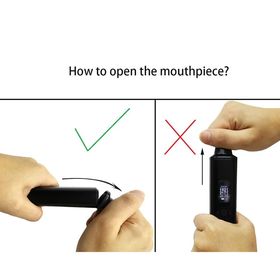 Нажмите кнопку питания 5 раз в течение 2 секунд для включения, xcreen отобразит главное меню и начнет нагреваться после того, как покажет «ald AMAZE'', время работы. ПрессКнопка питания 5 раз в течение 2 секунд для выключения.