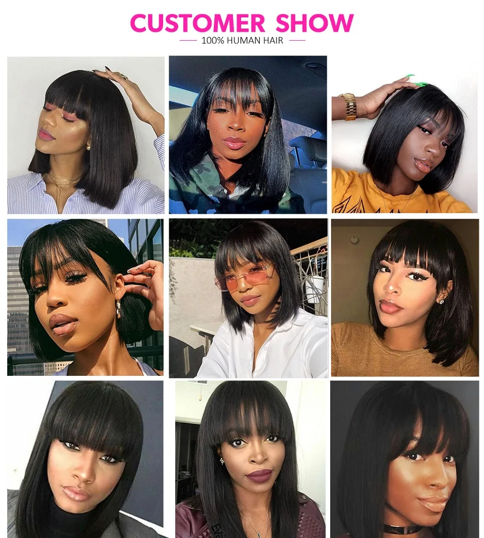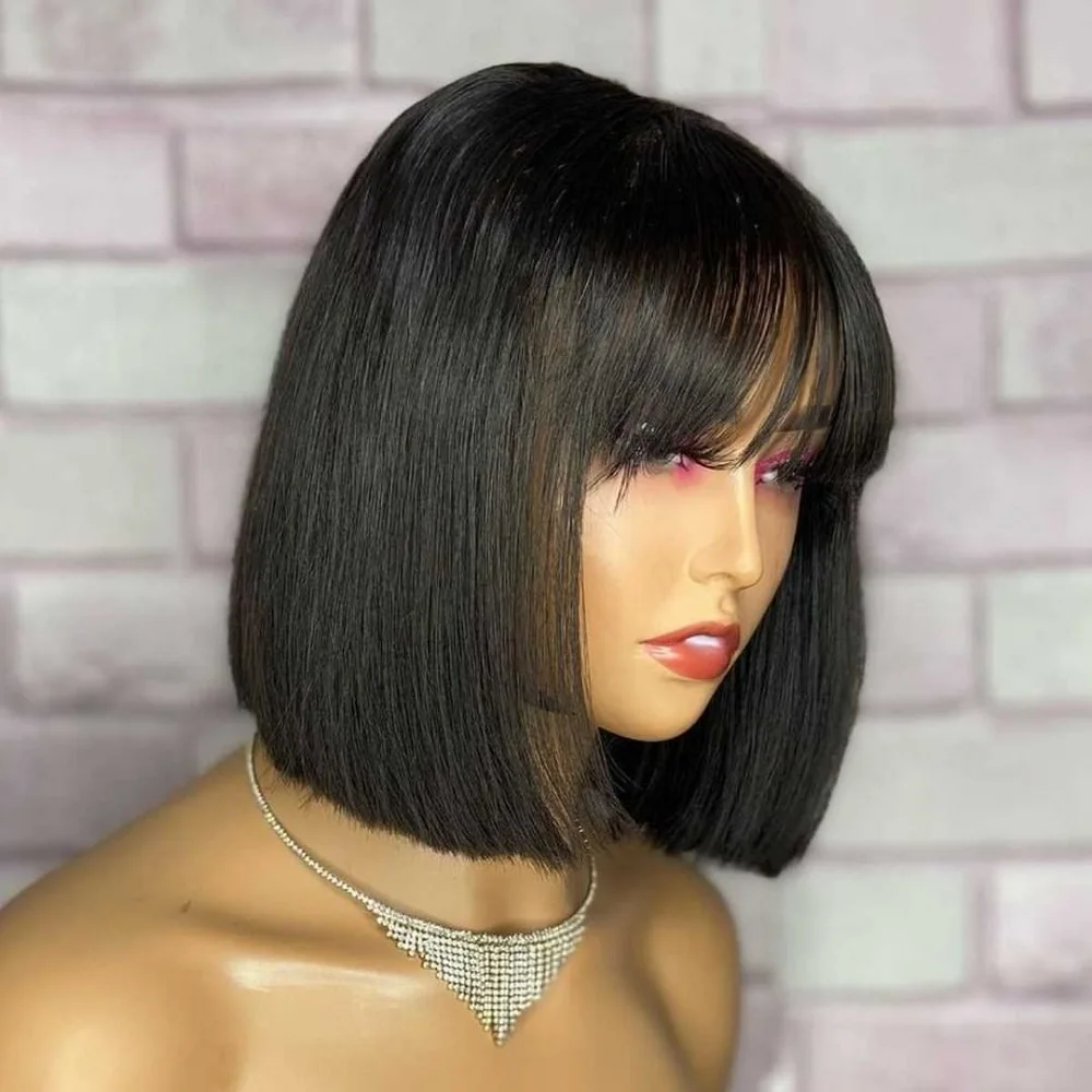 Короткий прямой парик Боб с челкой, парик из человеческих волос Боб, бразильские волосы Реми для женщин, полностью машинная работа, безклеевые летние парики