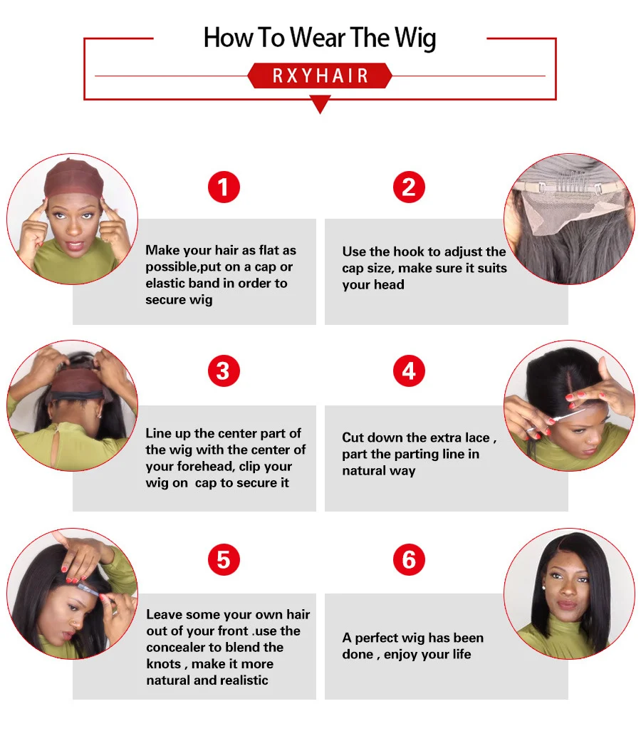 1. Сделайте волосы максимально плоскими, наденьте шапочку или эластичную ленту, чтобы закрепить парик2. Используйте крючок для регулировки размера крышки, убедитесь, что он соответствует вашей голове3. Выровняйте среднюю часть парика с центром вашего лба закрепите парик на шапочке, чтобы закрепить его4. Вырежьте лишнее кружево, разделите линию естественным образом.5. Оставьте свои собственные волосы спереди. Используйте консилер для смешивания узлов, чтобы сделать его более естественным и реалистичным6. Идеальный парик сделан, Наслаждайтесь жизнью.