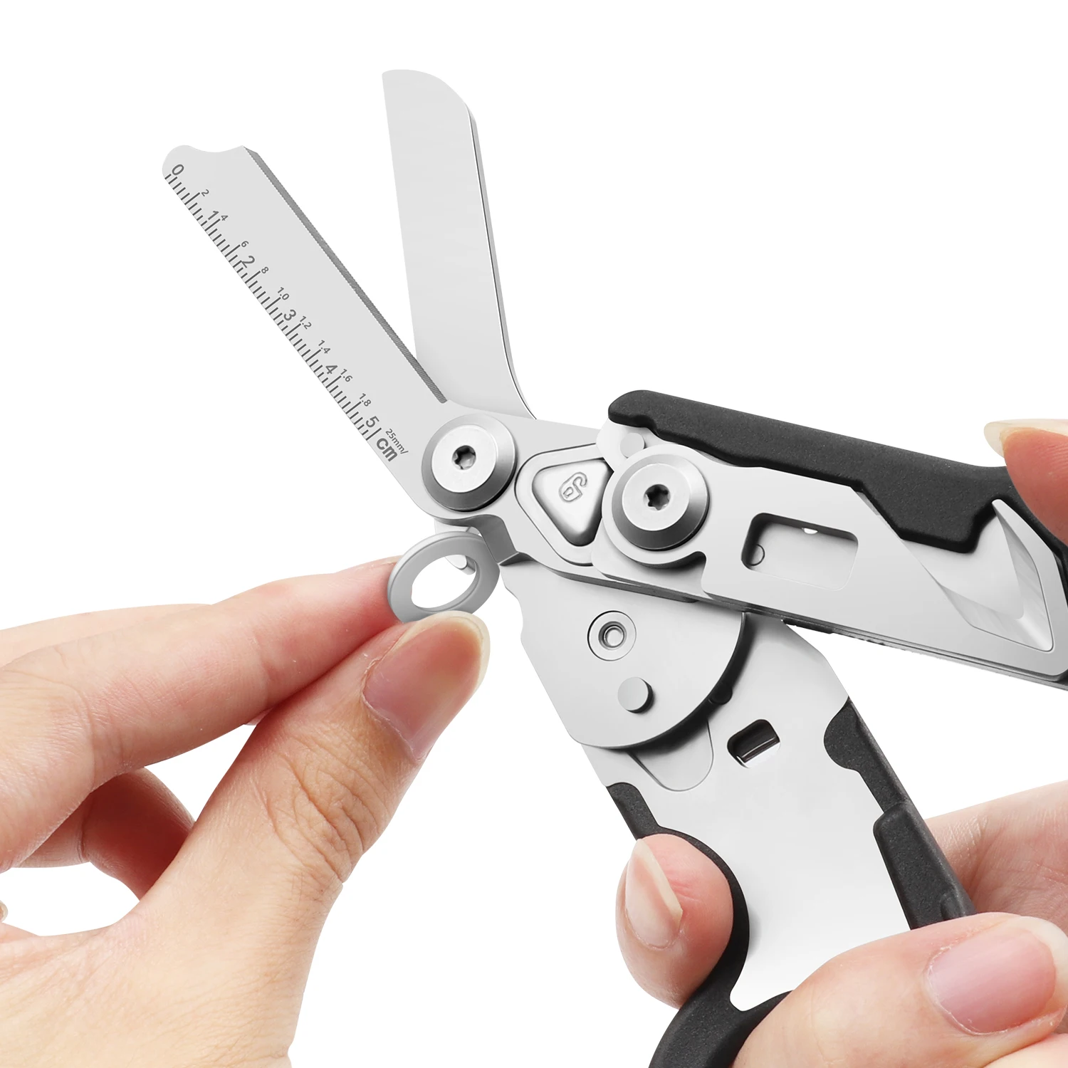 Характеристика:1. С обычной функцией стрижки.2. Имеет функцию открывания бутылок.3. Может отрезать тонкий металлический лист.4. Может быстро отрезать ремень безопасности автомобиля, чтобы избежать.5. Функция молотка безопасности.6. Компактный и легкий, легко носить с собой.