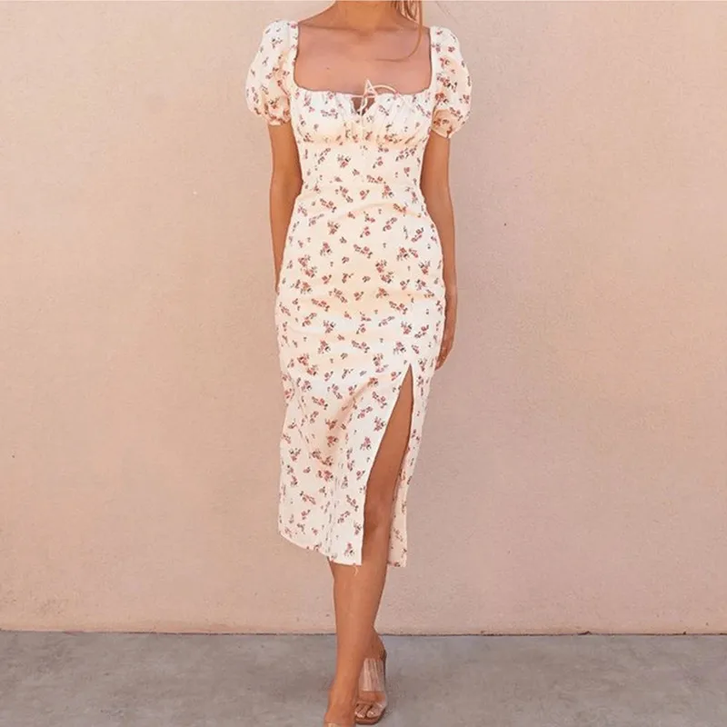 Женское платье с открытой спиной, длинное белое платье с рукавами-фонариками и цветочным принтом, с разрезом, сексуальная одежда для вечерние, y2k, на лето