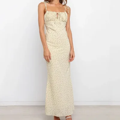 Платье-Макси женское с коротким рукавом-фонариком, рюшами и завязками