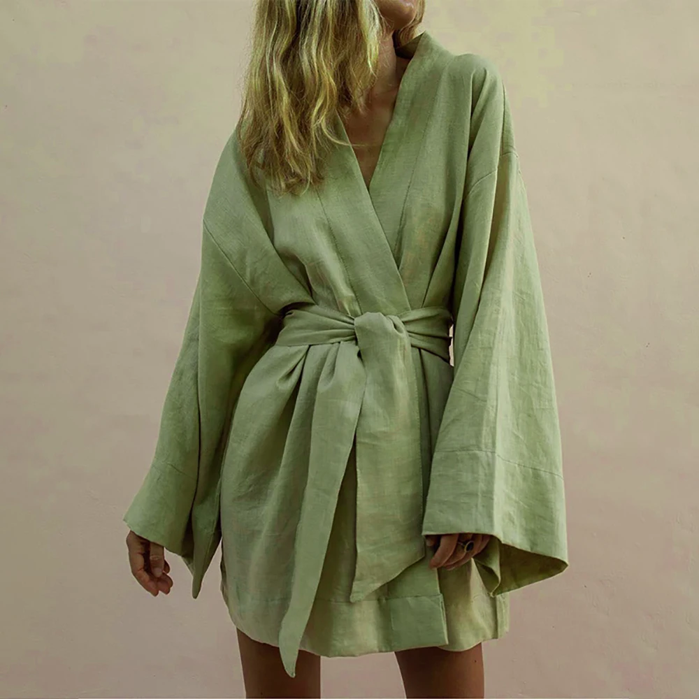 Женское кимоно с v-образным вырезом кардиган мини-платье из хлопка и льна с длинным рукавом, с поясом, платье с короткими рукавами Robe Стиль летние свободные брюки