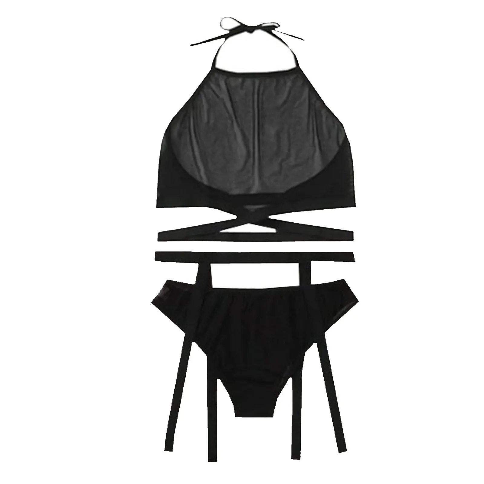 Сексуальный прозрачный бандажный черный комплект нижнего белья с лямкой на шее, женское элегантное модное сексуальное белье, газовое нижнее белье, боди, костюм-тройка