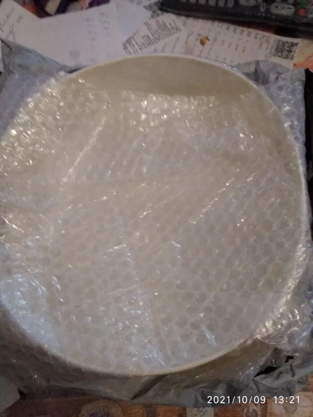 Посылка доставлялась на почту чуть больше месяца с отслеживанием. Продавец упаковал в пупырку, но её мало для такого товара. Поднос чуть выгнулся, но на его функцию это не влияет. Хорошо крутится, когда нагружен. Звезду сняла за цвет - продавцом заявлен белый, на самом деле он ближе к слоновой кости. Немного разочарована. Но в целом неплохой. Есть небольшой запах. Со скидкой Али обошёлся в 296 рублей. Сейчас продавец поднял цену и добавил доставку. С продавцом не общалась.