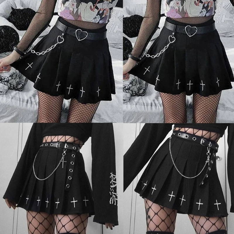 Женская плиссированная мини-юбка с высокой талией, черная трапециевидная юбка в стиле панк с вышивкой крестиком и оборками, уличная одежда