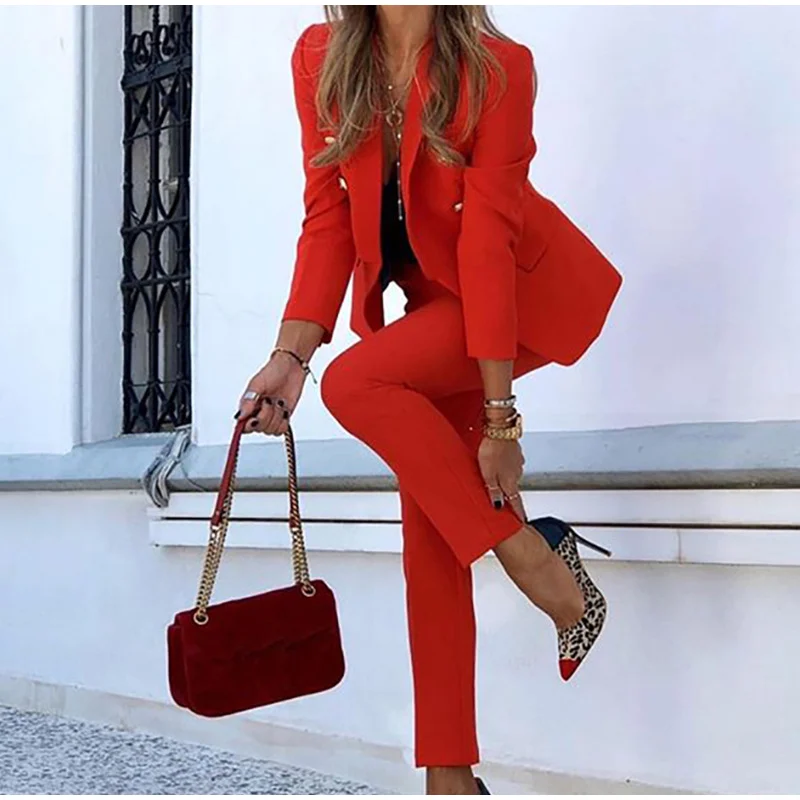 Весенний комплект из 2 предметов, Женский блейзер с длинным рукавом, однотонные прямые брюки с высокой талией, женские комплекты, новинка 2021, модный элегантный женский костюм