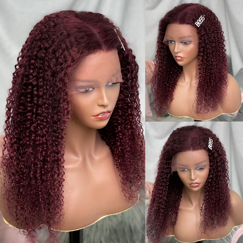 Бордовый кудрявый парик 99j 13X 4 из человеческих волос на сетке спереди, красный парик на сетке 4x4, бразильский парик с предварительно выщипанными детскими волосами 180%