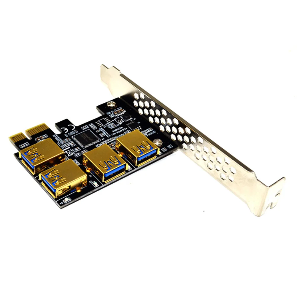 PCI-E к PCIe адаптер PCI-Express 1x к 16x Mining Riser Card 1 к 4 USB 3,0 мультипликатор для BTC MinerХарактеристика:Эффективно решить проблему недостаточного pci-e интерфейсов на материнской плате, один интерфейс может быть расширен до 4.Конструкция подключаемой карты может быть непосредственно подключена к интерфейсу материнской платы без удлинительного кабеля и может быть подключена к шасси, что значительно повышает стабильность и надежность.Основная плата управления принимает режим прямого питания интерфейса pci-e и не требует внешнего шнура питания. Основной блок питания не зависит от внешних помех и имеет более высокую стабильность.Уменьшая Количество адаптеров и перемычек, один провод напрямую подключается к интерфейсу, эффективно сокращая помехи интерфейса и потери линии, обеспечивая надежность данных и повышая эффективность работы.Разъем USB позолочен для уменьшения помех между интерфейсами и улучшения целостности данных.Добавлены BIOS, большая совместимость с материнскими платами и графическими картами и низкое энергопотребление.Спецификация:Поддерживаемые ОС: для Windows, для Mac, для LinuxИнтерфейс шины: PCI-E X1 (совместим с графическим интерфейсом X4, X8, X16)Количество интерфейсов: PCI-E X1, USB 3,0*4Размер изделия: 120*75*55 ммВес изделия: 70 гРазмер упаковки: 125*105*60 ммВес брутто: 90 гПримечание:Возможны незначительные отклонения в размере из-за ручного измерения, различных методов измерения и инструментов.Изображение может не отражать фактический цвет изделия из-за различного фотографирования светильник, угол и дисплей монитора.